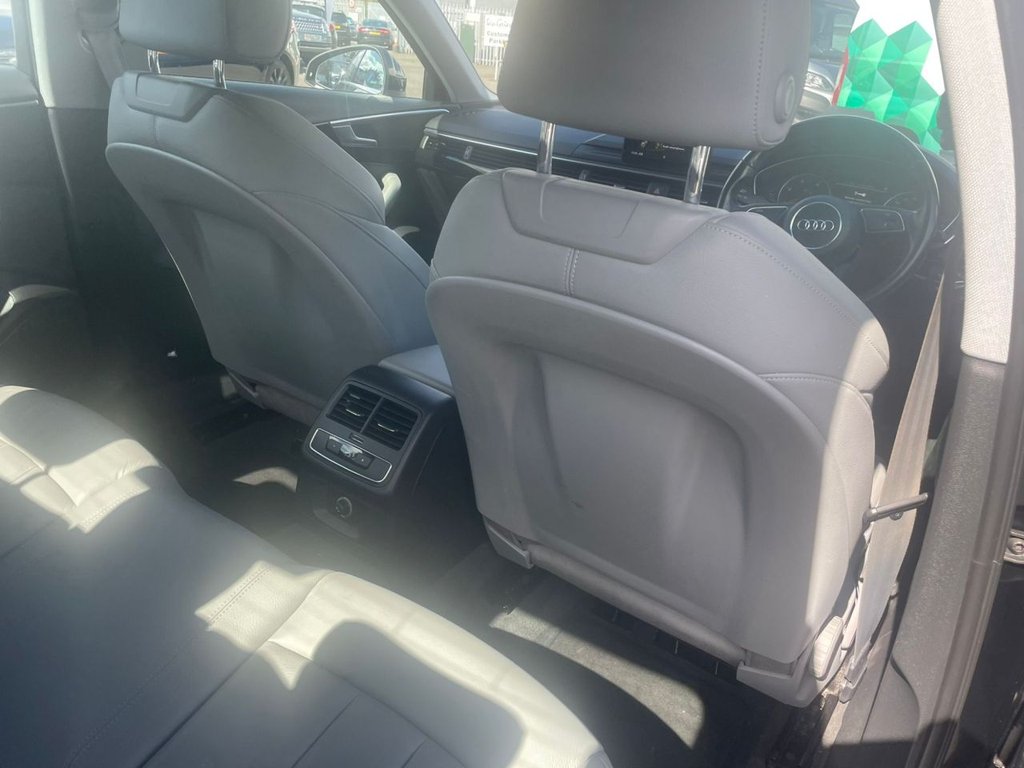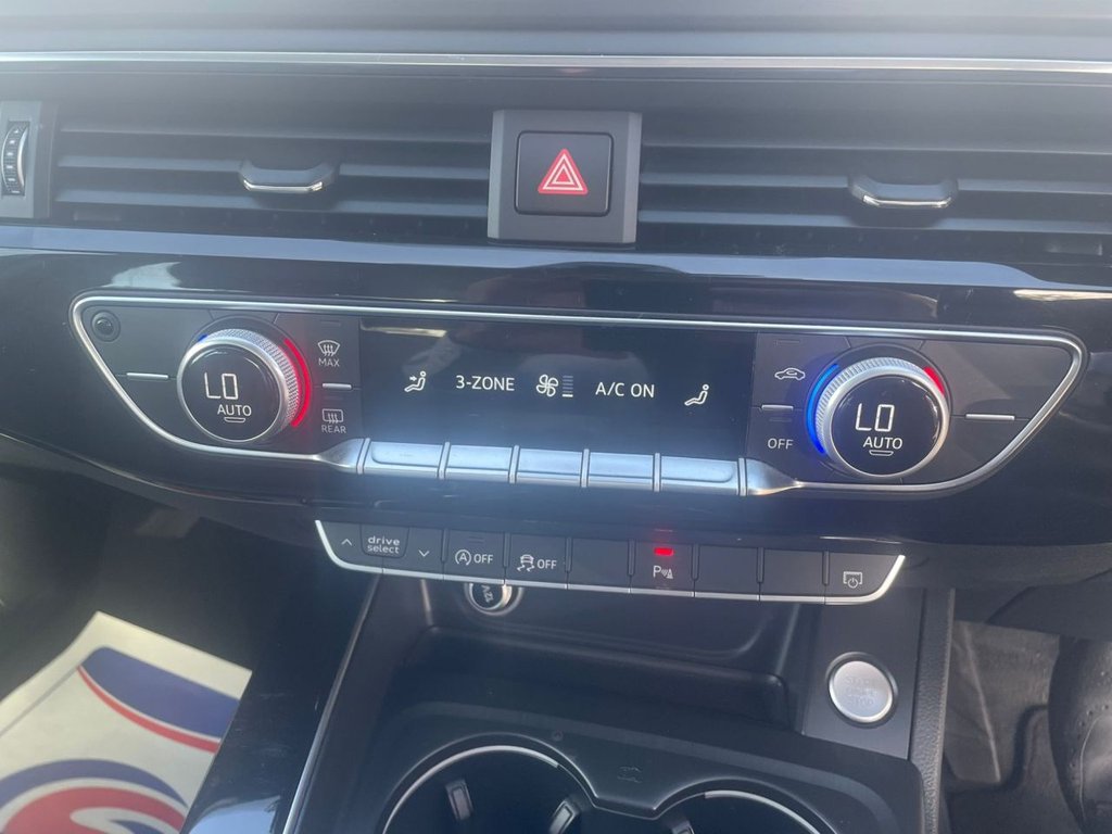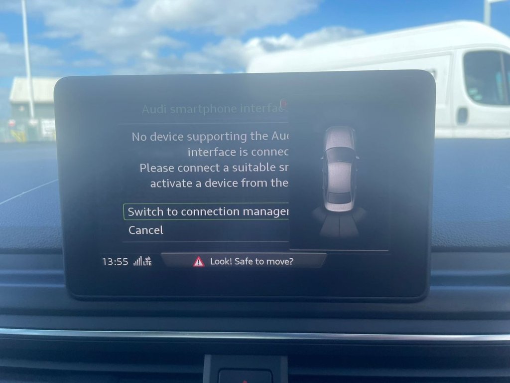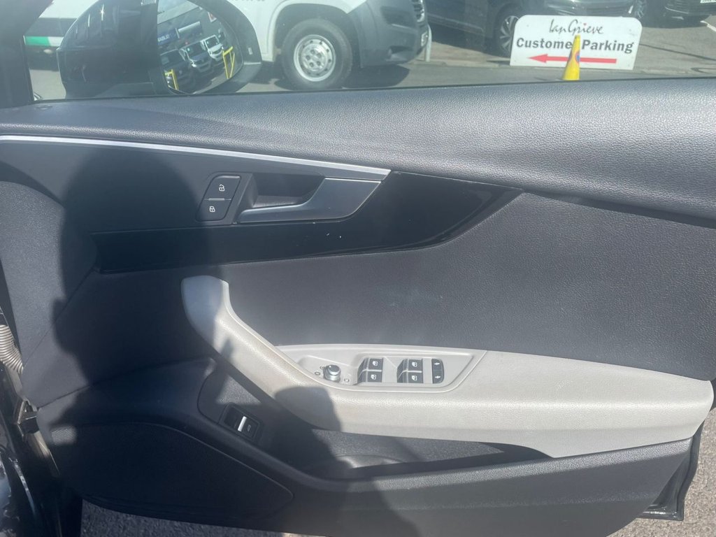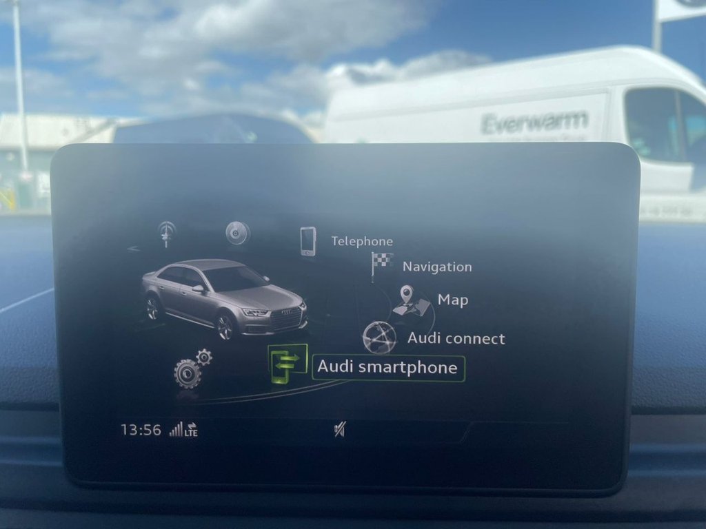 Audi drive select, Audi Pre sense collision avoidance, Audi smartphone interface, Auto boot lid opening, Electro-mechanical PAS, Service interval indicator, Stop/start button, Voice control system, Keyless Start, Locking wheel bolts, Remote central locking, Thatcham category 1 alarm + immobiliser, 2 USB ports, Aux input, DAB digital radio module, MMI radio plus with CD player, 3 zone climate control, Aluminium door sill trims, Front centre armrest with 12v socket, Front/rear floor mats, Isofix child seat preparation for front passenger/outer rear seats inc passenger airbag deactivation, Jack and tool kit, Reach + rake adjustable steering column, Rear headrests, Split folding rear seats, Sunvisors with vanity mirrors, Top tether anchor plate for isofix child seat, Acoustic windscreen, Air inlets in titanium black, Auto dimming rear view mirror, Automatic headlights + automatic windscreen wipers, Body coloured bumpers, Body coloured door mirrors, Chrome door handles, Chrome rolled exhaust, Electric adjustable heated door mirrors, Electric front windows, Electric rear windows, Headlight range control, LED daytime running lights, LED indicators in door mirrors, Rear diffuser in Titan black, Titan black radiator grille with chrome inlay, Low rolling resistance tyres, Exterior aluminium pack - A4, 3 point seatbelts on all rear seats, ABS/EBD, Adaptive driver and front passenger airbags, Electromechanical parking brake, ESP, First aid kit, Front head airbags, Front seatbelt pretensioners + load limiters, Front side airbags, Multi-Collision braking, Seatbelt warning, Traction control, Tyre pressure monitoring system, Warning triangle