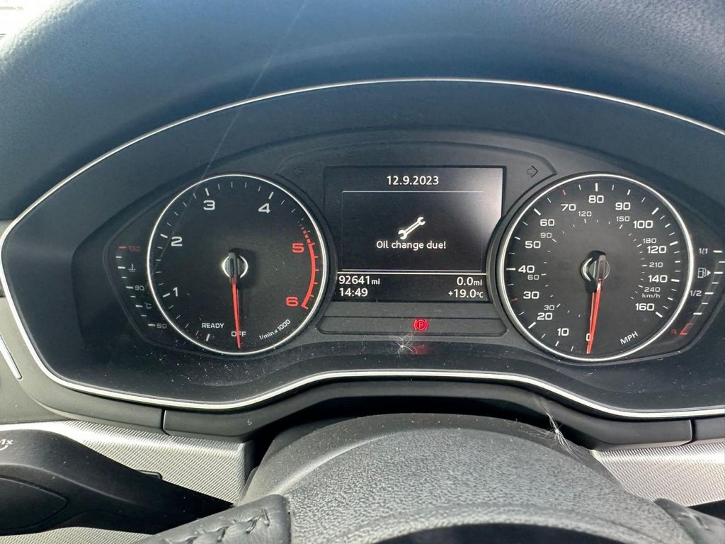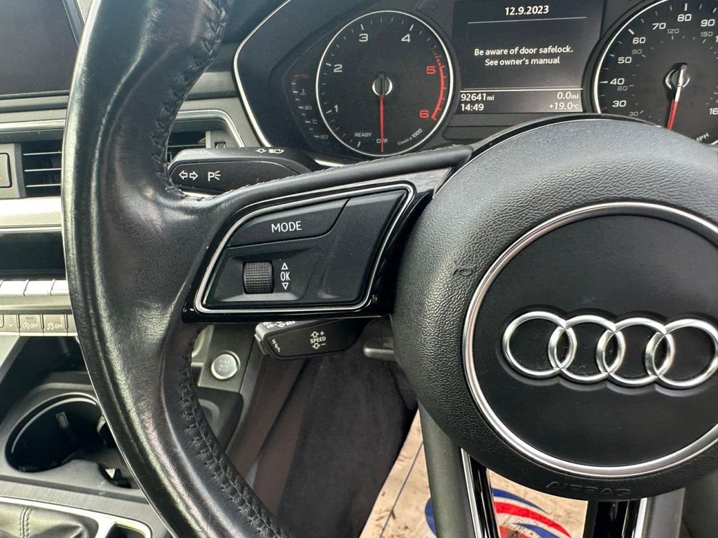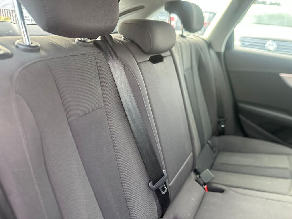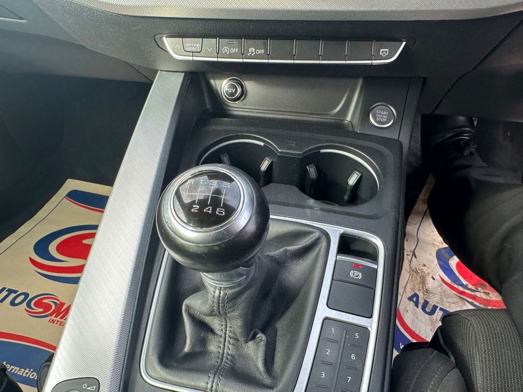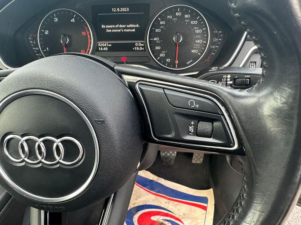 Audi drive select, Audi Pre sense collision avoidance, Audi smartphone interface, Electro-mechanical PAS, Power boot opening and closing, Service interval indicator, Stop/start button, Voice control system, Keyless Start, Locking wheel bolts, Remote central locking, Thatcham category 1 alarm + immobiliser, 2 USB ports, Aux input, DAB digital radio module, MMI radio plus with CD player, 3 zone climate control, Aluminium door sill trims, Front centre armrest with 12v socket, Front/rear floor mats, Isofix child seat preparation for front passenger/outer rear seats inc passenger airbag deactivation, Jack and tool kit, Reach + rake adjustable steering column, Rear headrests, Retractable load area cover, Split folding rear seats, Sunvisors with vanity mirrors, Top tether anchor plate for isofix child seat, Acoustic windscreen, Air inlets in titan black with two horizontal inlays in chrome, Auto dimming rear view mirror, Automatic headlights + automatic windscreen wipers, Body coloured bumpers, Chrome door handles, Chrome rolled exhaust, Electric adjustable heated door mirrors, Electric front windows, Electric rear windows, Headlight range control, LED daytime running lights, LED indicators in door mirrors, Rear diffuser in Twilight grey matt, Rear wiper, Low rolling resistance tyres, Space saver spare wheel, 3 point seatbelts on all rear seats, ABS/EBD, Adaptive driver and front passenger airbags, Electromechanical parking brake, ESP, First aid kit, Front head airbags, Front seatbelt pretensioners + load limiters, Front side airbags, Seatbelt warning, Traction control, Tyre pressure monitoring system, Warning triangle