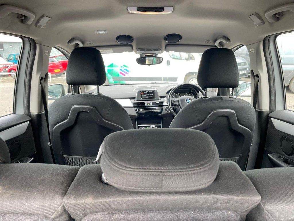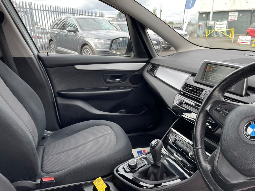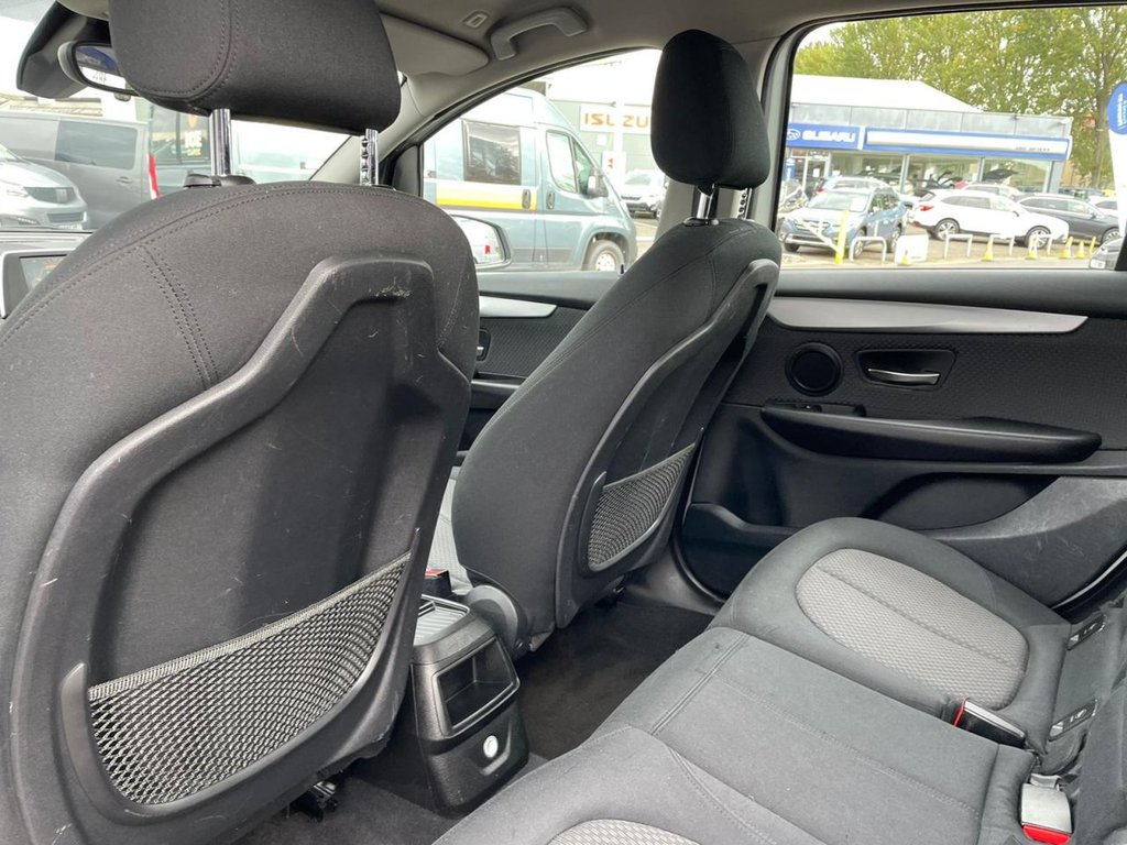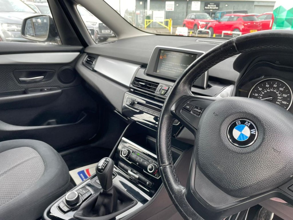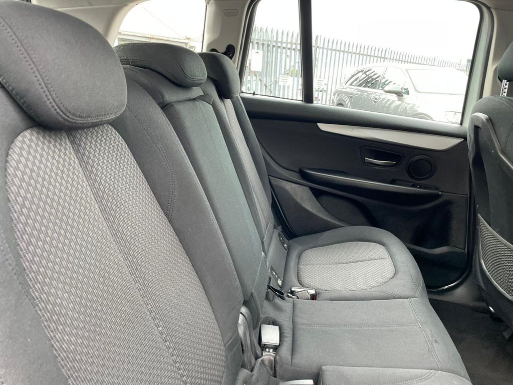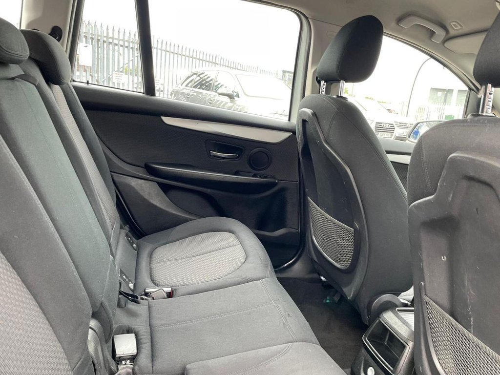 Attentiveness assist, Automatic tailgate operation, BMW Online services, BMW Teleservices, Check control system, Cruise control with brake assist, Door/boot open warning light, Forward collision warning, Lights on warning, Oil temperature gauge, On board computer, Outside temperature display, Personal Profile, Service interval indicator, Speed limiter, Stop/start button, Electronic immobiliser, Key integrated remote control central locking, Locking wheel bolts, Remote control Thatcham category 1 alarm, Drive Performance Control, Electronic differential lock, Extended lights package - 2 Series Gran Tourer, Extended storage pack - 2 Series Active/Gran Tourer, 3 point seatbelts on all seats, ABS, BMW emergency call, Brake assist function, Childproof rear door locks, Collision mitigation braking system, Crash Sensor - activates hazard/interior lighting + unlocks doors, Driver/Front Passenger airbags, DSC+, Dynamic Traction Control - DTC, Front and rear curtain airbags, Front passenger airbag deactivation, Front seatbelt force limiters, Front seatbelt pretensioner, Front side airbags, Hill start assist, Seatbelt warning, Side impact protection, Tyre pressure monitoring system, Warning triangle and first aid kit, Auxiliary point for auxiliary devices, Bluetooth audio streaming, BMW professional radio/CD/MP3, DAB Digital radio, 12V sockets in front centre console and passenger footwell, 2 individual fold flat 3rd row seats, 3 rear headrests, 3 spoke sports leather multi-function steering wheel, 4 grab handles, 40:20:40 split folding rear bench seat, Anthracite Velour floor mats, Dual zone automatic air conditioning, Front armrest, Front head restraints, Front seatback folding trays, Front/rear armrests within door panels, Illuminated glovebox, Isofix front passenger and rear seat preparation, Luggage compartment lighting, Reach + rake adjustable steering column, Rear centre armrest, Sliding rear seats, Sunvisors, Underfloor stowage compartment, Body coloured door handles, Body coloured door mirrors, Body coloured roof mouldings, Chrome exhaust tailpipe, Chrome kidney grille with black vertical slats, Door mirror integrated indicators, Door sill finishers, Electric adjustable heated door mirrors, Electric front/rear windows with one touch/auto up/down, Follow me home headlights, Front fog lights, Green tinted heat insulating glass, Heated windscreen washer jets, High beam assistant, LED daytime running lights, Rain sensor including auto headlights activation, Rear wiper, Welcome lighting, Low rolling resistance tyres, Tyre mobility system