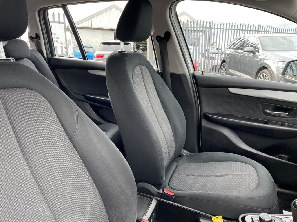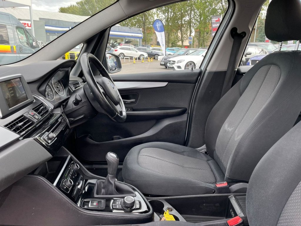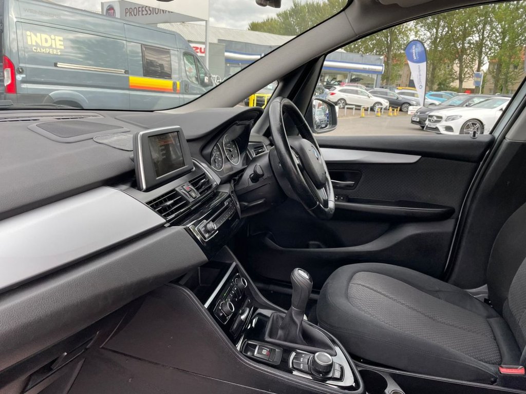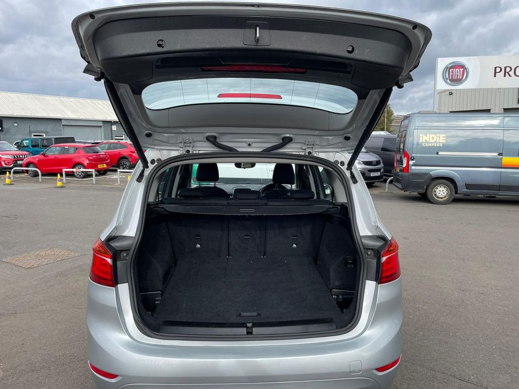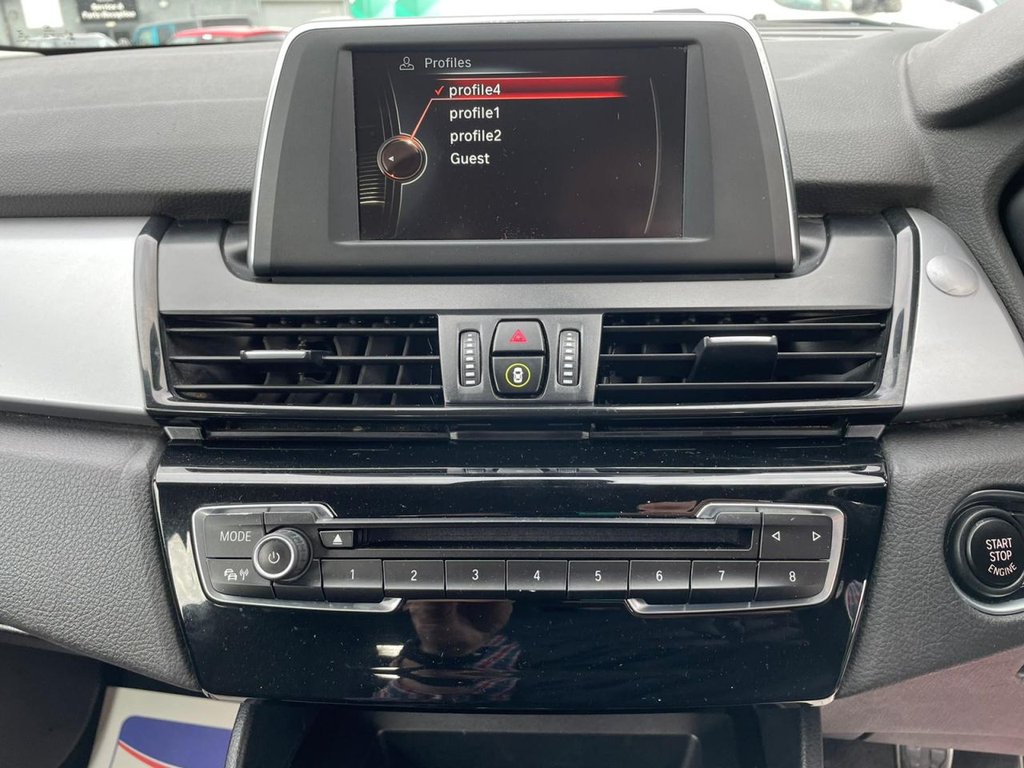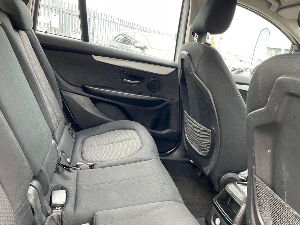 Attentiveness assist, Automatic tailgate operation, BMW Online services, BMW Teleservices, Check control system, Cruise control with brake assist, Door/boot open warning light, Forward collision warning, Lights on warning, Oil temperature gauge, On board computer, Outside temperature display, Personal Profile, Service interval indicator, Speed limiter, Stop/start button, Electronic immobiliser, Key integrated remote control central locking, Locking wheel bolts, Remote control Thatcham category 1 alarm, Drive Performance Control, Electronic differential lock, Extended lights package - 2 Series Gran Tourer, Extended storage pack - 2 Series Active/Gran Tourer, 3 point seatbelts on all seats, ABS, BMW emergency call, Brake assist function, Childproof rear door locks, Collision mitigation braking system, Crash Sensor - activates hazard/interior lighting + unlocks doors, Driver/Front Passenger airbags, DSC+, Dynamic Traction Control - DTC, Front and rear curtain airbags, Front passenger airbag deactivation, Front seatbelt force limiters, Front seatbelt pretensioner, Front side airbags, Hill start assist, Seatbelt warning, Side impact protection, Tyre pressure monitoring system, Warning triangle and first aid kit, Auxiliary point for auxiliary devices, Bluetooth audio streaming, BMW professional radio/CD/MP3, DAB Digital radio, 12V sockets in front centre console and passenger footwell, 2 individual fold flat 3rd row seats, 3 rear headrests, 3 spoke sports leather multi-function steering wheel, 4 grab handles, 40:20:40 split folding rear bench seat, Anthracite Velour floor mats, Dual zone automatic air conditioning, Front armrest, Front head restraints, Front seatback folding trays, Front/rear armrests within door panels, Illuminated glovebox, Isofix front passenger and rear seat preparation, Luggage compartment lighting, Reach + rake adjustable steering column, Rear centre armrest, Sliding rear seats, Sunvisors, Underfloor stowage compartment, Body coloured door handles, Body coloured door mirrors, Body coloured roof mouldings, Chrome exhaust tailpipe, Chrome kidney grille with black vertical slats, Door mirror integrated indicators, Door sill finishers, Electric adjustable heated door mirrors, Electric front/rear windows with one touch/auto up/down, Follow me home headlights, Front fog lights, Green tinted heat insulating glass, Heated windscreen washer jets, High beam assistant, LED daytime running lights, Rain sensor including auto headlights activation, Rear wiper, Welcome lighting, Low rolling resistance tyres, Tyre mobility system