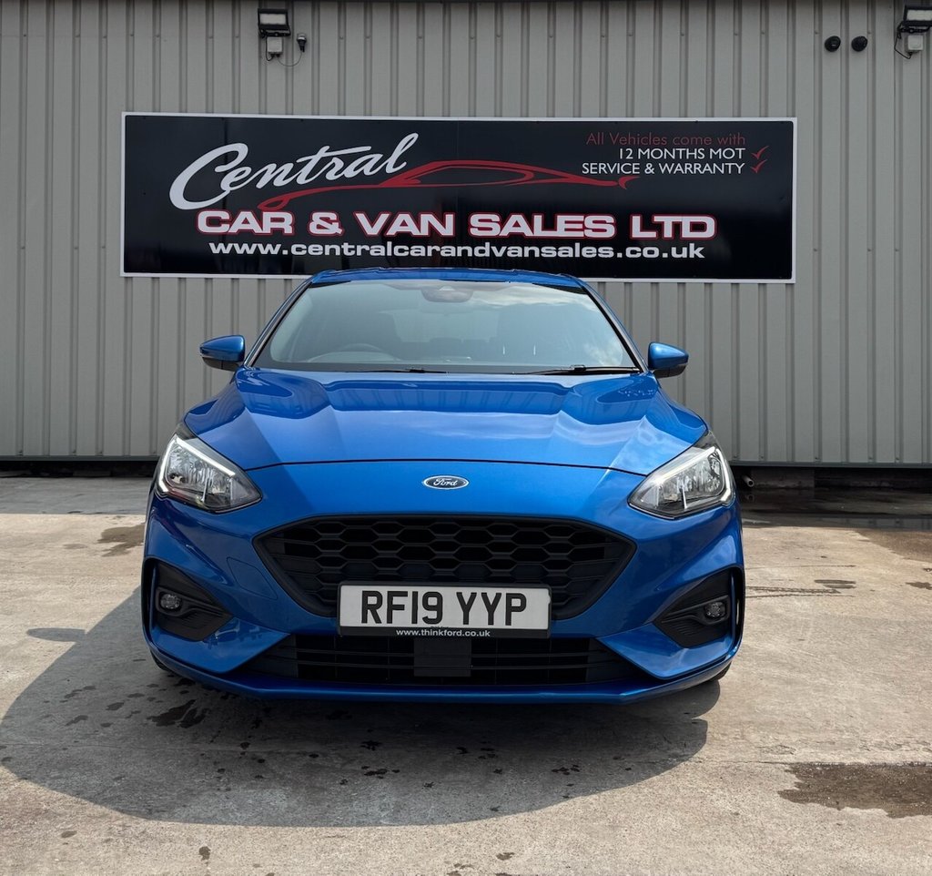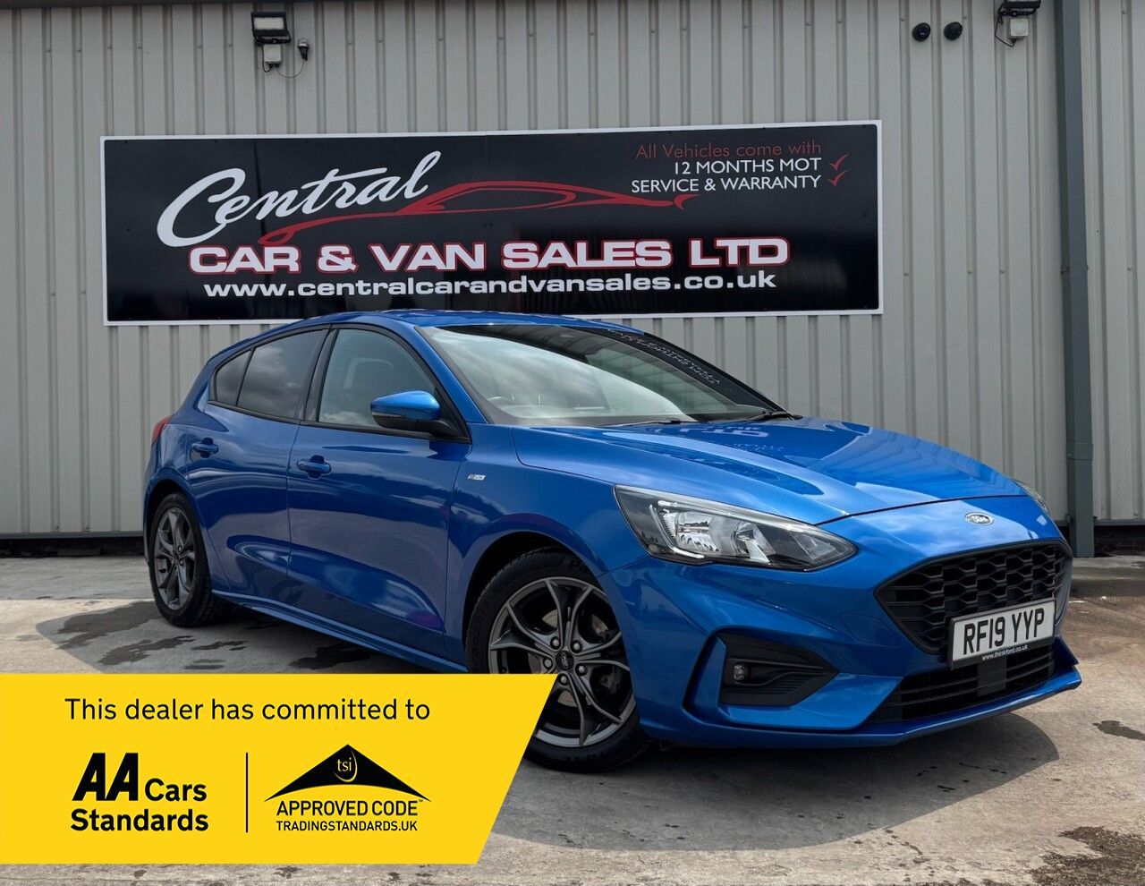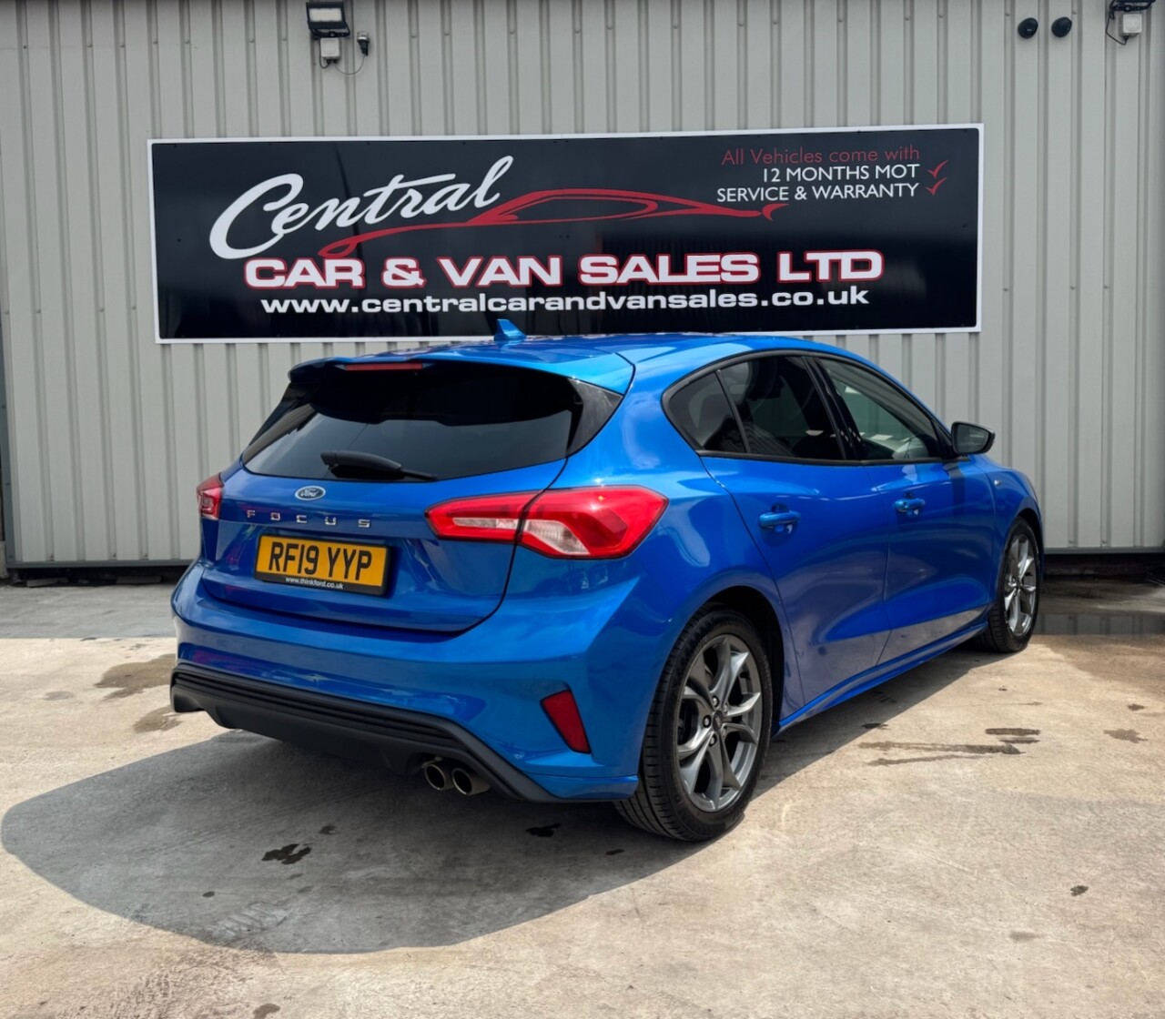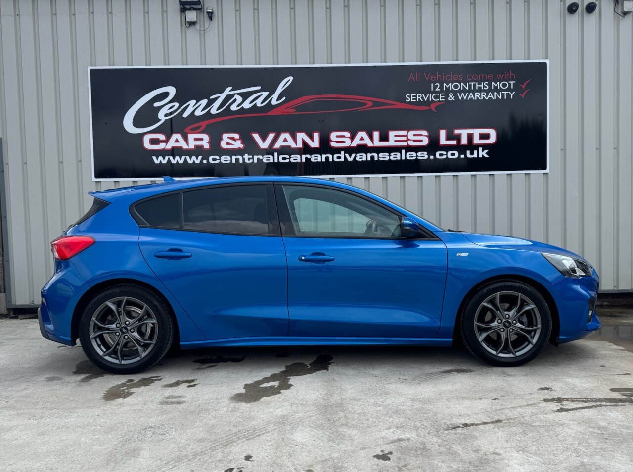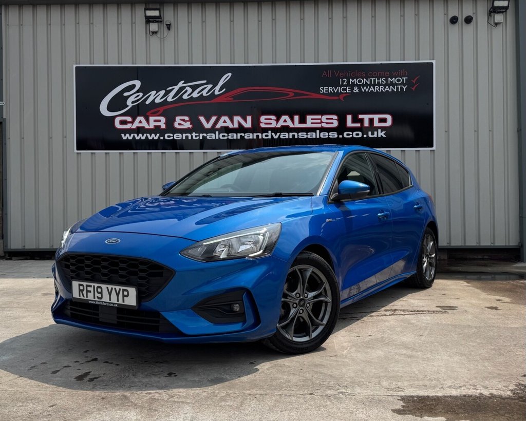 2019 Ford Focus 1.0 EcoBoost ST-Line 5Dr hatchback finished in a stunning Nitrous Blue with 17" Twin spoke alloy wheels, With 1 keeper from new coming with 2 keys and Full service history. Also coming with a good specification including, multifunctional steering wheel, Cruise control, Auto lights, Electric mirrors, Lane keeping system, Bluetooth, DAB radio, A/C, 6 speed manual, Stop/Start, Electric handbrake, Auto hold and Stainless steel ST line kick plates. The Focus costs £195 for road tax and is in insurance group 12E and the fuel economy returns 48MPG Urban, 69MPG Extra-Urban and 60MPG Combined. All round the car has been well looked after and maintained to the highest standard and comes with everything you need. We also provide all customers with a 12 month MOT and fresh service carried out by us and a 3 month nationwide Warranty for piece of mind.