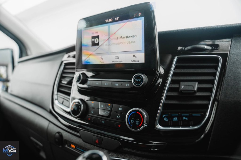 16" 6.5 alloy wheels, 180 Degree rear cargo check arms, 2 12v sockets, 2 Interior grab handles, 3 point seatbelts for all seats, 80 litre fuel tank, ABS, Assist handle, Audio controls mounted on steering wheel, Auto locking on drive-away, Auto relocking, Auto start/stop system, Automatic headlamps with follow me home, Automatic lights and wipers, Body coloured body side mouldings, Body coloured door handles, Body coloured door mirrors, Body coloured exterior mirror finish, Body coloured lift/decklid exterior handles, Body coloured rear bumpers, Chormed grille with 3 bars, Cloth upholstery, Colour keyed exterior pack, Complete rear trim board, Configurable Unlocking, Delete roof mounted turn signals, Diesel particulate filter, Digital rear view mirror, Door open tyre carrier drop, Driver and passenger sunvisors with illuminated vanity mirrors, Drivers airbag, Dual note electric horn, Easy fuel capless refuelling system, Electric front windows with one touch facility for driver and front passenger, Embedded modem, Emergency brake light flashing, ESP, Extra heavy duty alternator, Floorwell lights, Ford Eco mode, Front manual air conditioning, Front outer passenger airbag with deactivation switch, Front splash guards/Mud flaps, Full wheelcovers, Header mounted courtesy lights - 2 map lights, Header mounted package tray, Headlamp levelling, Height adjustable drivers seatbelt mount, Height adjustable front headrests, High roof line, Illuminated footwell, Inclination anti-Theft sensor, Interior trim accent pack C - Transit custom, Intermittent front wash/wipe, Kerbside side load doors, Leather gearshift knob, LED load compartment rail light, Less rear seat pack - Transit Custom, Load area protection kit 2 - Transit Custom, Load compartment interior light, Lockable glove box, Locking wheel lug nut, Low roof line, Map reading lights, Mechanical parking brake, Molded load floor liner, Partial molded headliner, PAS, Passenger airbag restraint, Passenger seatbelt height adj, Passenger underseat storage box, Power door dead locks, Power point, Quad beam headlamps, Reach and rake adjustable steering column, Rear cargo hinged door, Rear door edge warn reflectors, Rear mudflaps, Rear splash guards, Recirculation heater, Remote central locking, Roll stability control, Seatbelt remainder for driver and passenger, Selectable drive mode, Side rear door trim panel - Level 1, Side wind mitigation, Speed dependent power lock group, Standard duty suspension, Sunglasses roof storage, Thatcham category 1 alarm with 2nd remote key, Tool kit, Trip computer, Tutone painted plastic front bumper, Unrestricted side load door opening, Vehicle maintenance monitor, Wide bodyside grey mouldings