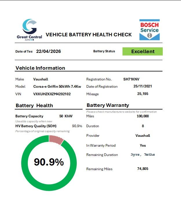 ## BATTERY STATE OF HEALTH CHECK 90.9% ## Boasting a remarkably low mileage for its 2021 registration, this Vauxhall Corsa Electric Griffin presents an exceptional opportunity. With only 25,193 miles on the clock and a full service history, this electric hatchback is in excellent condition. Its MOT is valid until November 2026, and a clear vehicle history check provides further peace of mind. The Corsa Electric Griffin is equipped with a 50 kWh battery, offering a maximum range of 209 miles when new. Notable features include a Panoramic Rear View Camera and Front Camera System for comprehensive parking assistance, alongside Rear Parking Distance Sensors. Inside, you'll find Electronic Climate Control and the Multimedia Navi System, which seamlessly integrates Android Auto and Apple CarPlay, plus Bluetooth connectivity. This Vauxhall Corsa Electric Griffin stands out with its efficient electric powertrain and impressive charging capabilities. A full charge at home using a 7kW charger takes approximately 7 hours and 30 minutes, perfect for overnight top ups. For faster charging on the go, it can reach 80% capacity from empty in just 36 minutes at a public charging station. These charging times, combined with its low mileage and comprehensive feature set, indicate that this Corsa Electric Griffin offers a superior ownership experience compared to many other electric vehicles of its age.