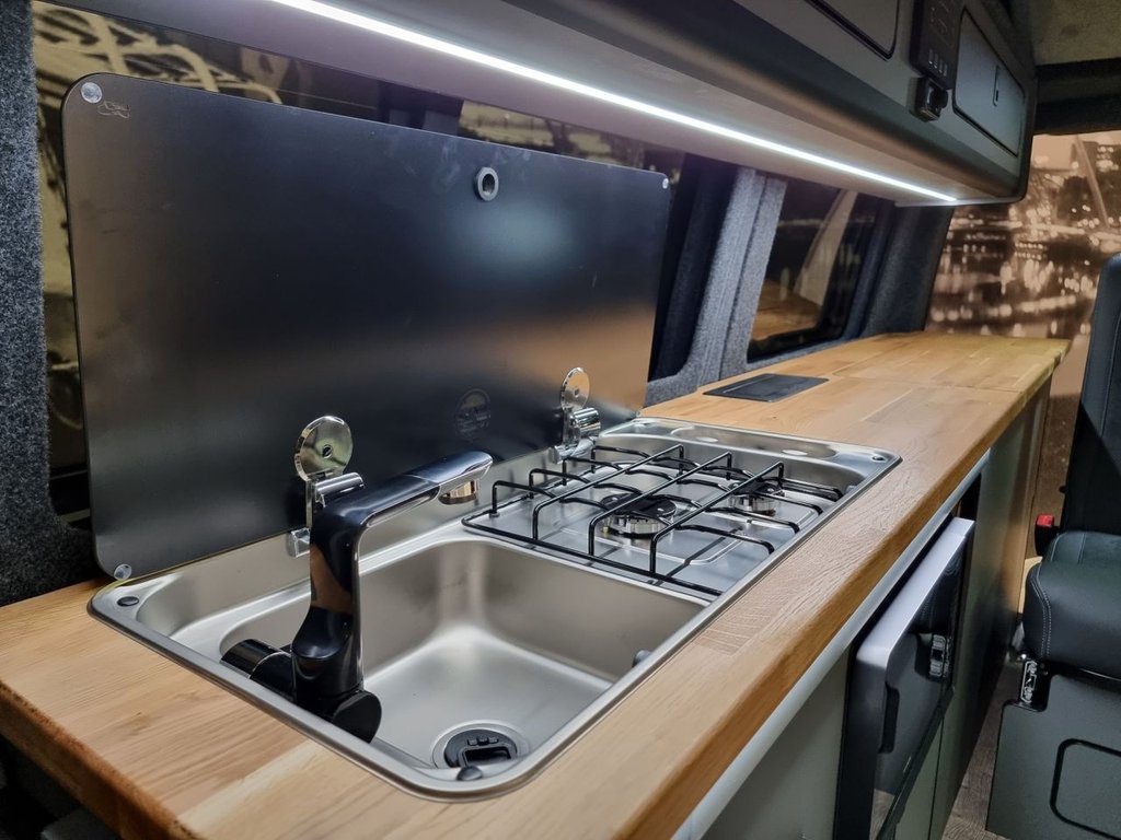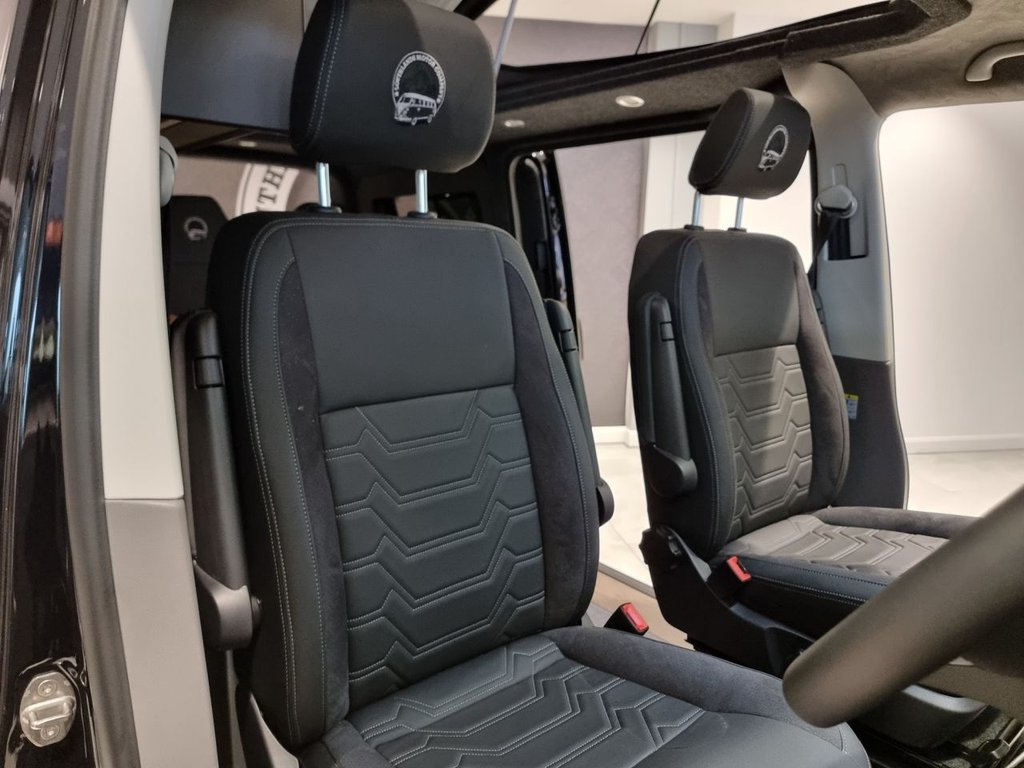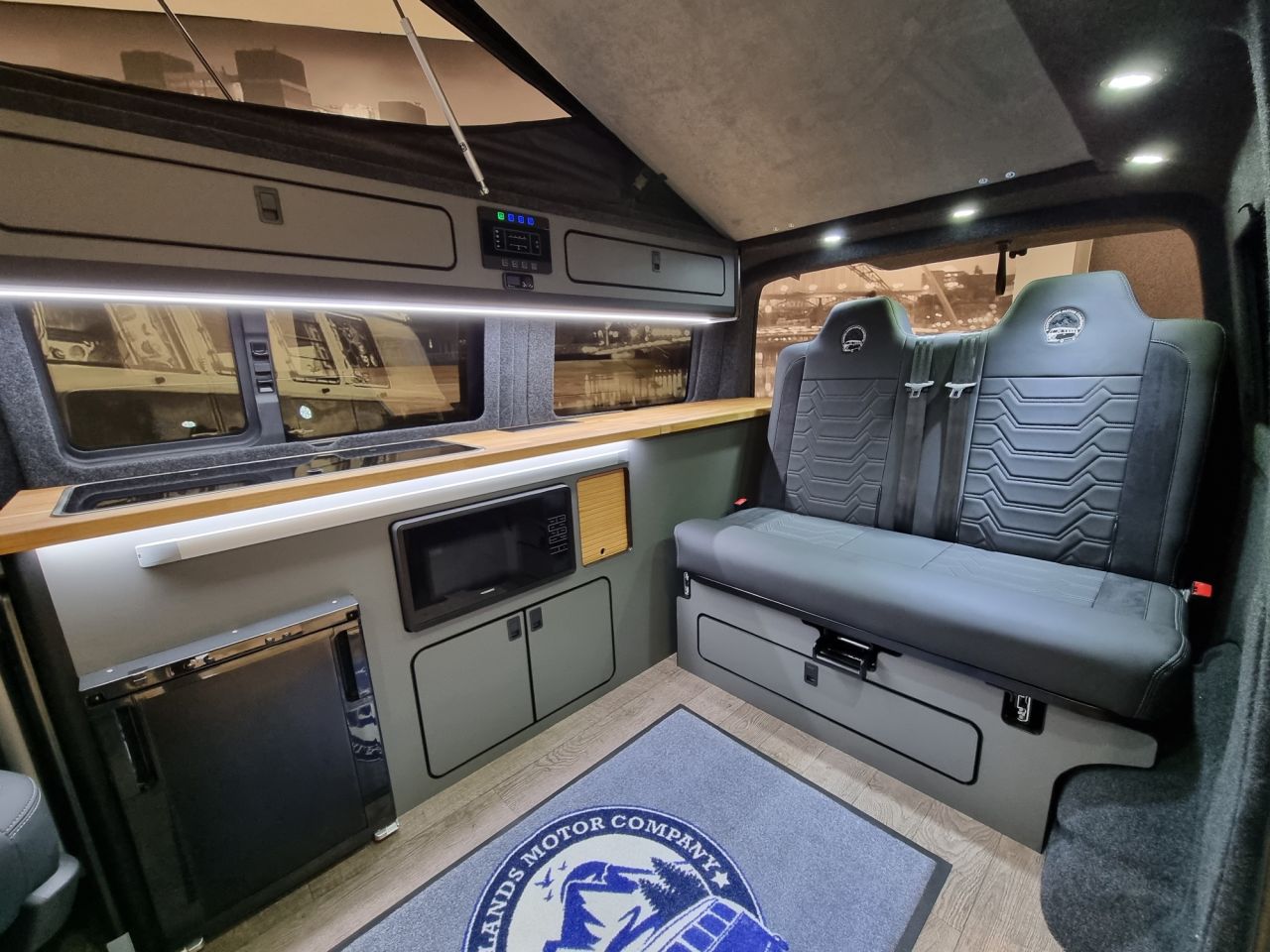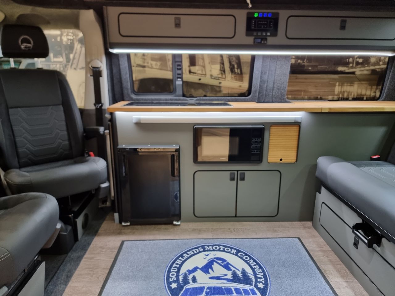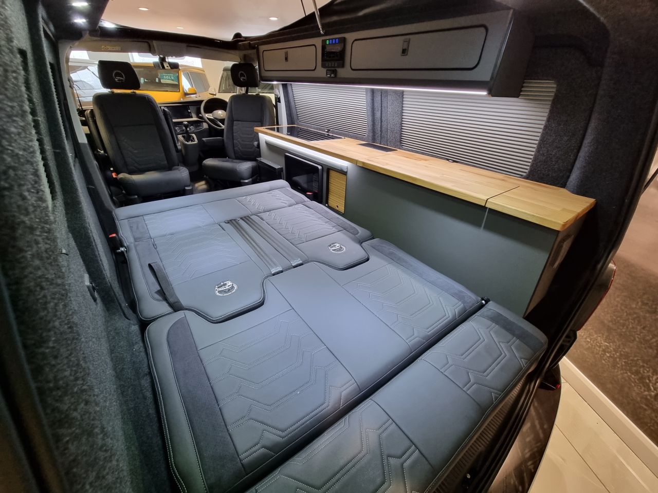 Westdubs poptop roof with scenic canvas Elevating upper bed system Privacy glass all-round Full extended furniture Solid oak worktop with hinged lid for storage Oak tambour doors to match worktop Flush soft close doors with black flush catch's Can double burner and sink unit Fold down tap 50L fridge freezer with LG compressor Dometic camper spec microwave CBE PC180 power management system Sterling split charge system Flush mount soft close sockets - 2 x 240v & 1 x double usb Cool white LED lighting throughout Onboard 130amp leisure battery Onbaord gas locker for 907 gas bottle Under chassis 69L water tank High pressure shower Storage for thetford 335 porta potti within cabinetry Vanshade thermal blinds throughout Planar 2kw diesel heater with 7 day programmable timer M1 tested Fabworx rock n roll bed