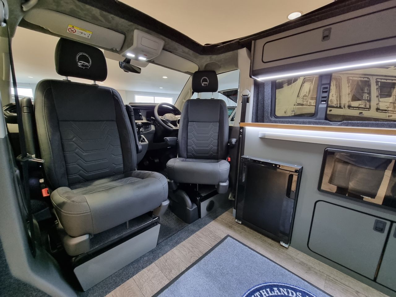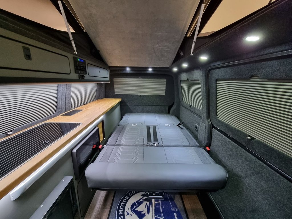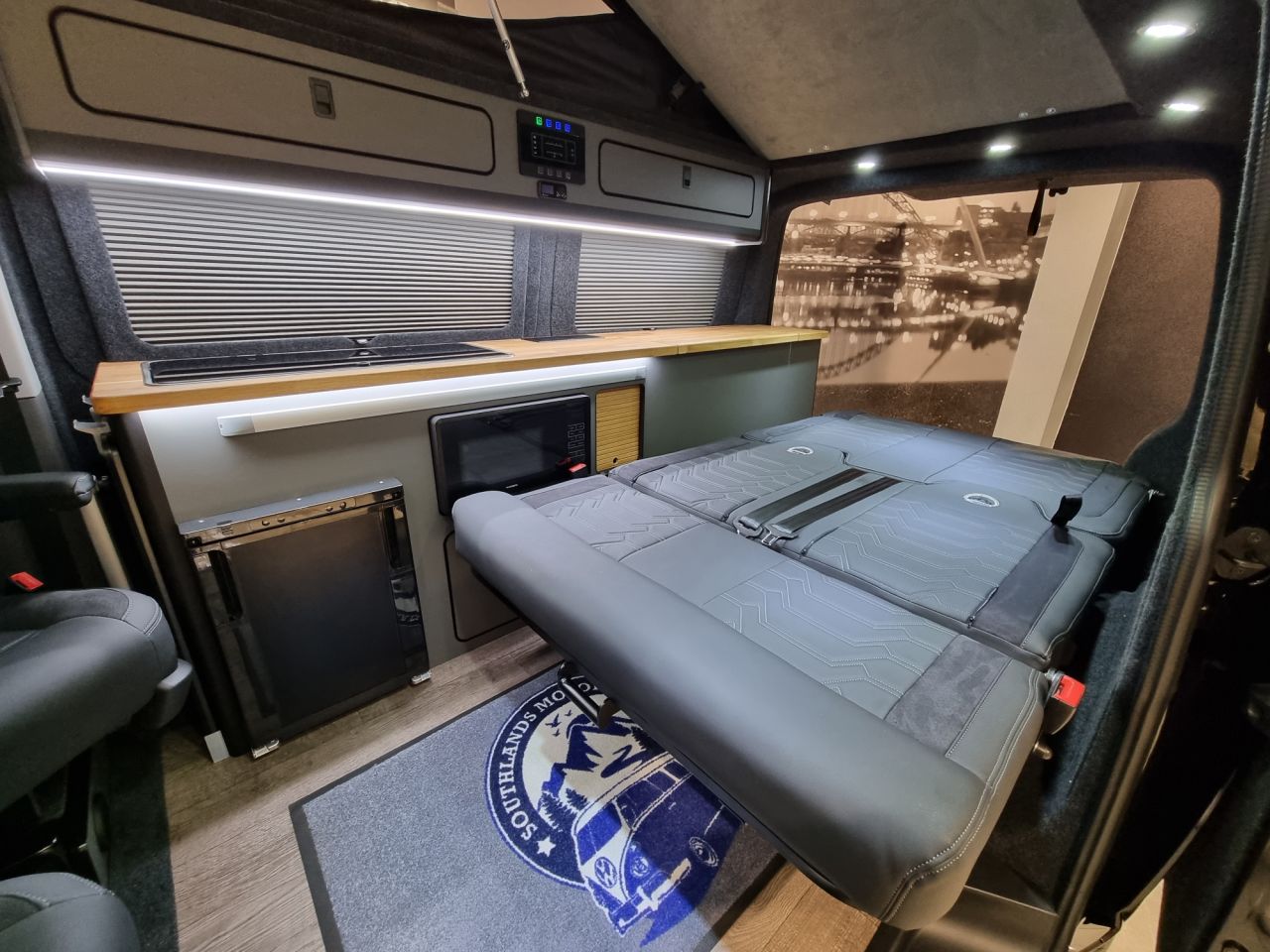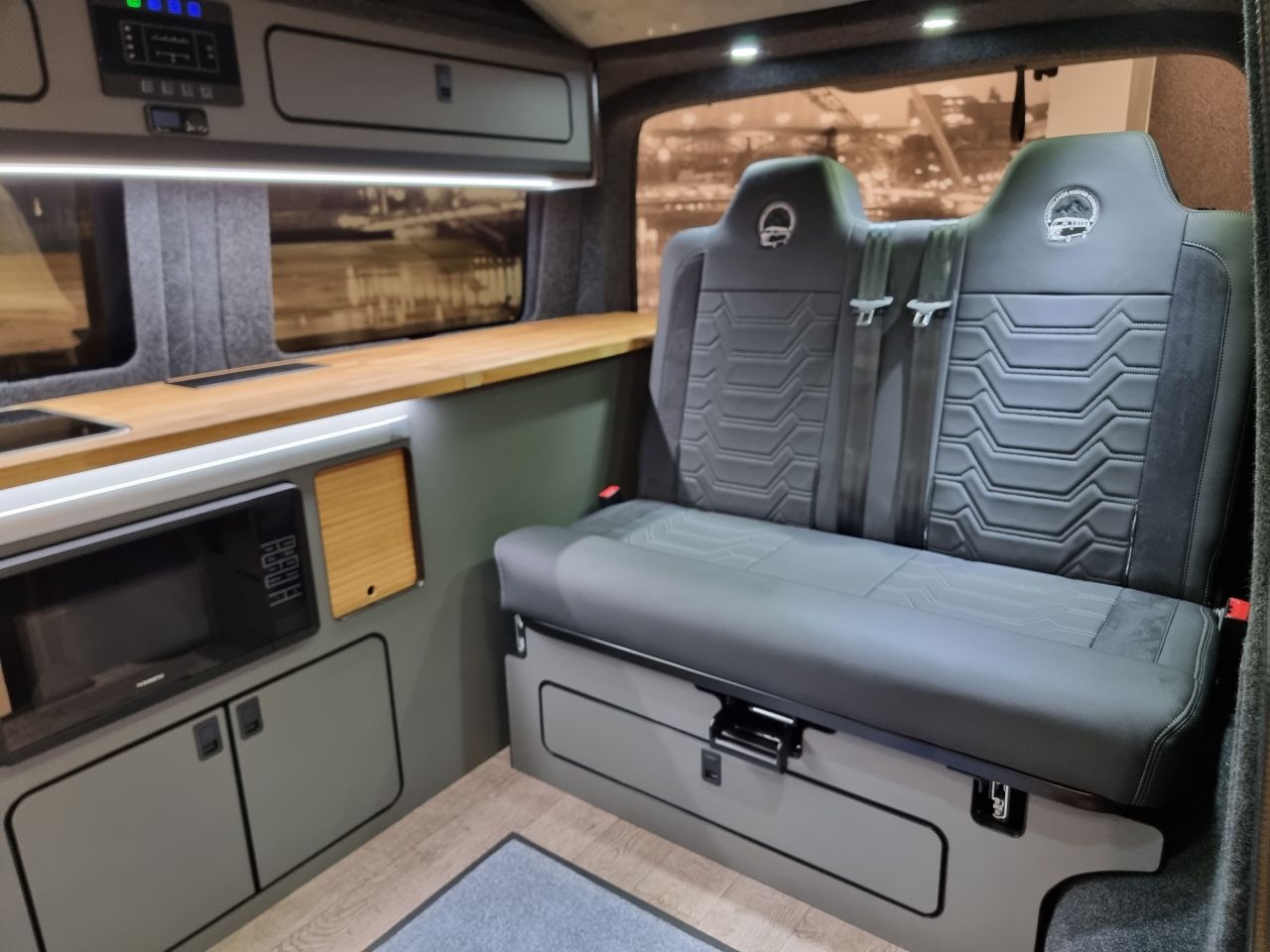 Westdubs poptop roof with scenic canvas Elevating upper bed system Privacy glass all-round Full extended furniture Solid oak worktop with hinged lid for storage Oak tambour doors to match worktop Flush soft close doors with black flush catch's Can double burner and sink unit Fold down tap 50L fridge freezer with LG compressor Dometic camper spec microwave CBE PC180 power management system Sterling split charge system Flush mount soft close sockets - 2 x 240v & 1 x double usb Cool white LED lighting throughout Onboard 130amp leisure battery Onbaord gas locker for 907 gas bottle Under chassis 69L water tank High pressure shower Storage for thetford 335 porta potti within cabinetry Vanshade thermal blinds throughout Planar 2kw diesel heater with 7 day programmable timer M1 tested Fabworx rock n roll bed