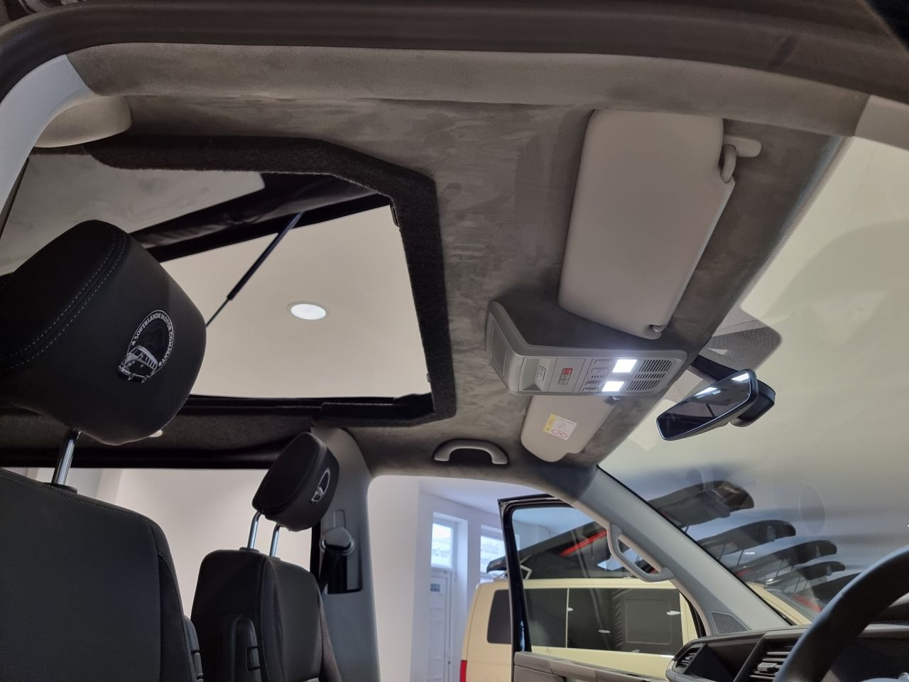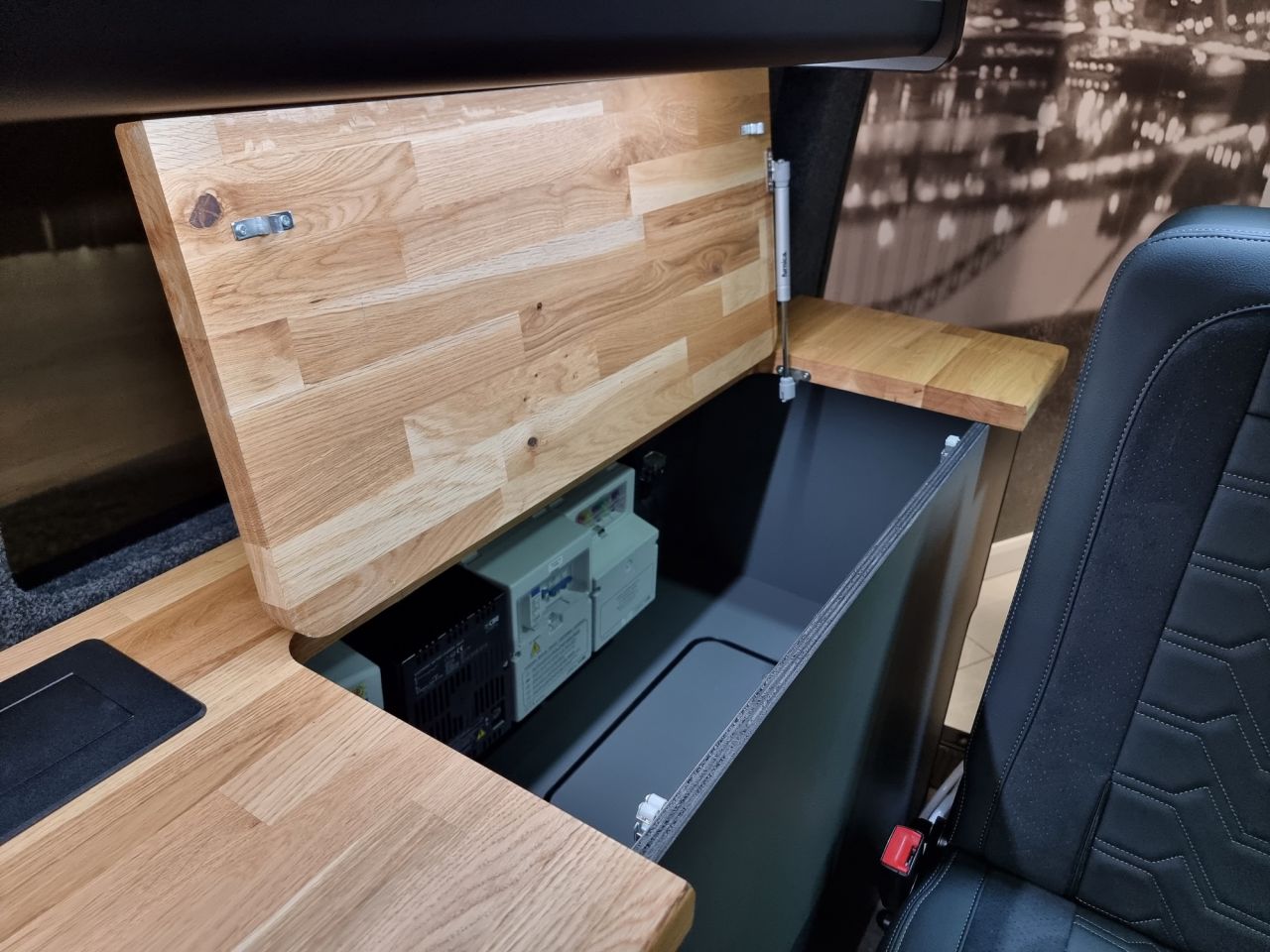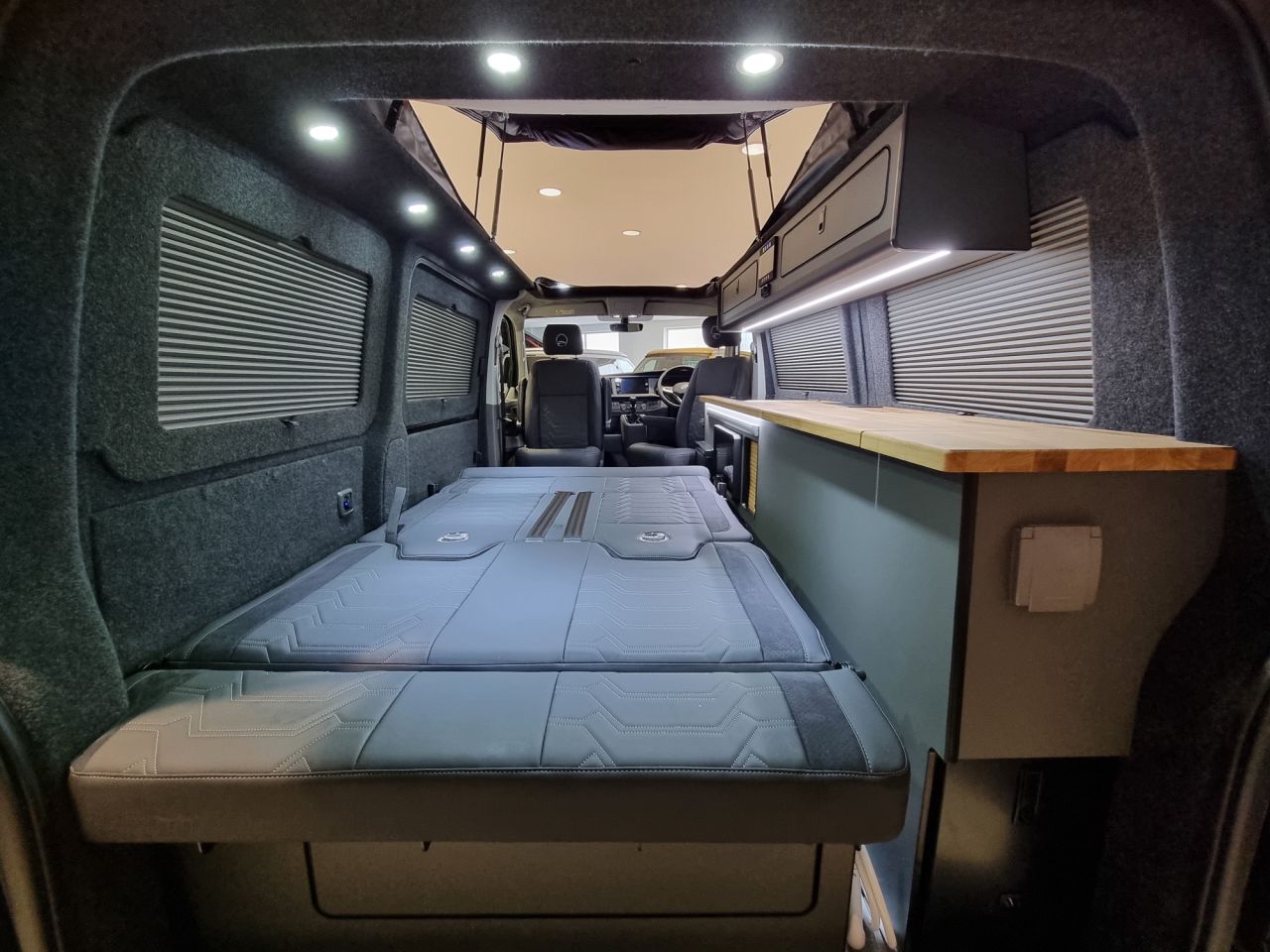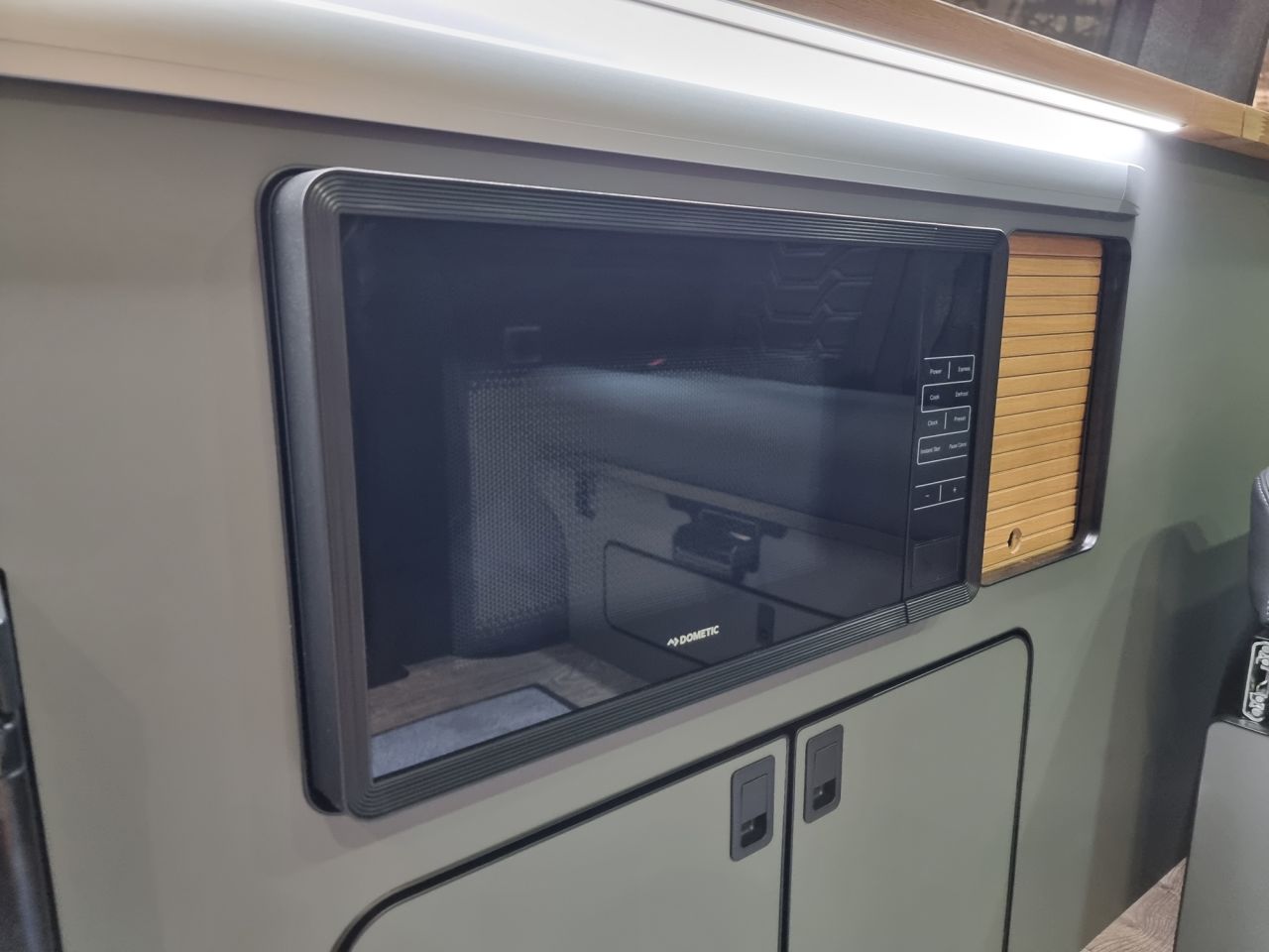 Westdubs poptop roof with scenic canvas Elevating upper bed system Privacy glass all-round Full extended furniture Solid oak worktop with hinged lid for storage Oak tambour doors to match worktop Flush soft close doors with black flush catch's Can double burner and sink unit Fold down tap 50L fridge freezer with LG compressor Dometic camper spec microwave CBE PC180 power management system Sterling split charge system Flush mount soft close sockets - 2 x 240v & 1 x double usb Cool white LED lighting throughout Onboard 130amp leisure battery Onbaord gas locker for 907 gas bottle Under chassis 69L water tank High pressure shower Storage for thetford 335 porta potti within cabinetry Vanshade thermal blinds throughout Planar 2kw diesel heater with 7 day programmable timer M1 tested Fabworx rock n roll bed