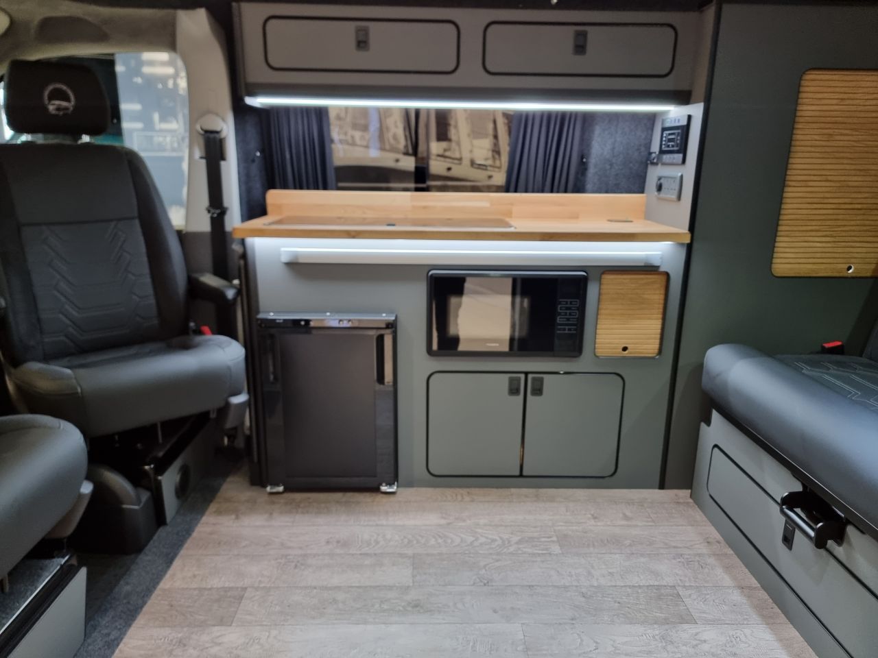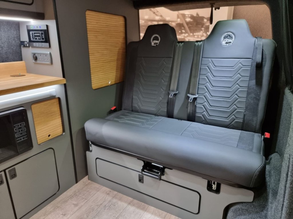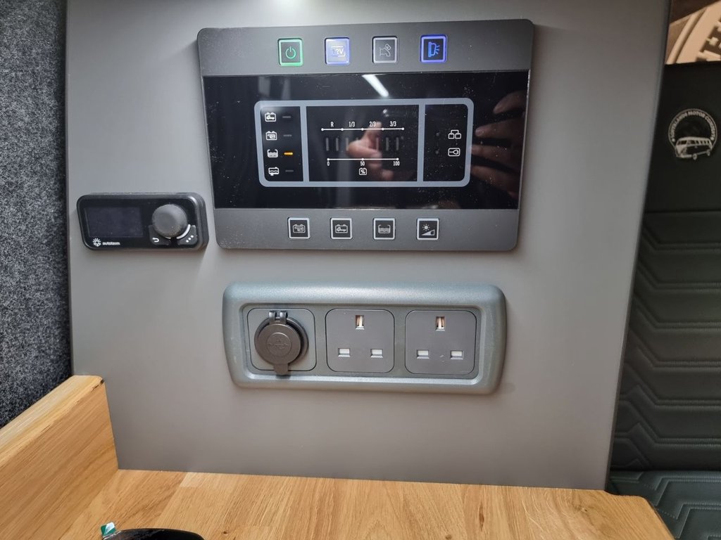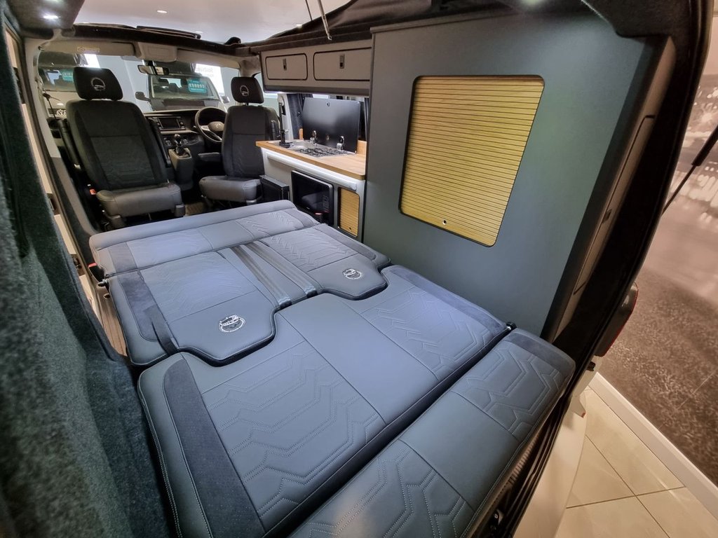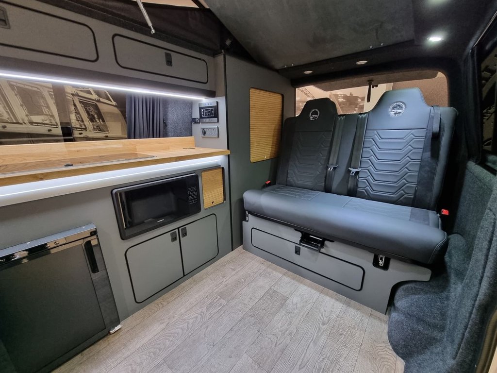 Westdubs poptop roof with scenic canvas Elevating upper bed system Privacy glass all-round Full furniture Solid oak worktop Oak tambour doors to match worktop Flush soft close doors with black flush catch's Can double burner and sink unit Fold down tap 50L fridge freezer with LG compressor Dometic camper spec microwave CBE PC180 power management system Sterling split charge system 2 x 240v & 1 x double usb Wireless charger Cool white LED lighting throughout Onboard 2 x 110amp leisure battery's Onbaord gas locker for 907 gas bottle Onboard 20L water tank Storage for thetford 335 porta potti within cabinetry Blackout curtains throughout Planar 2kw diesel heater with 7 day programmable timer M1 tested Fabworx rock n roll bed