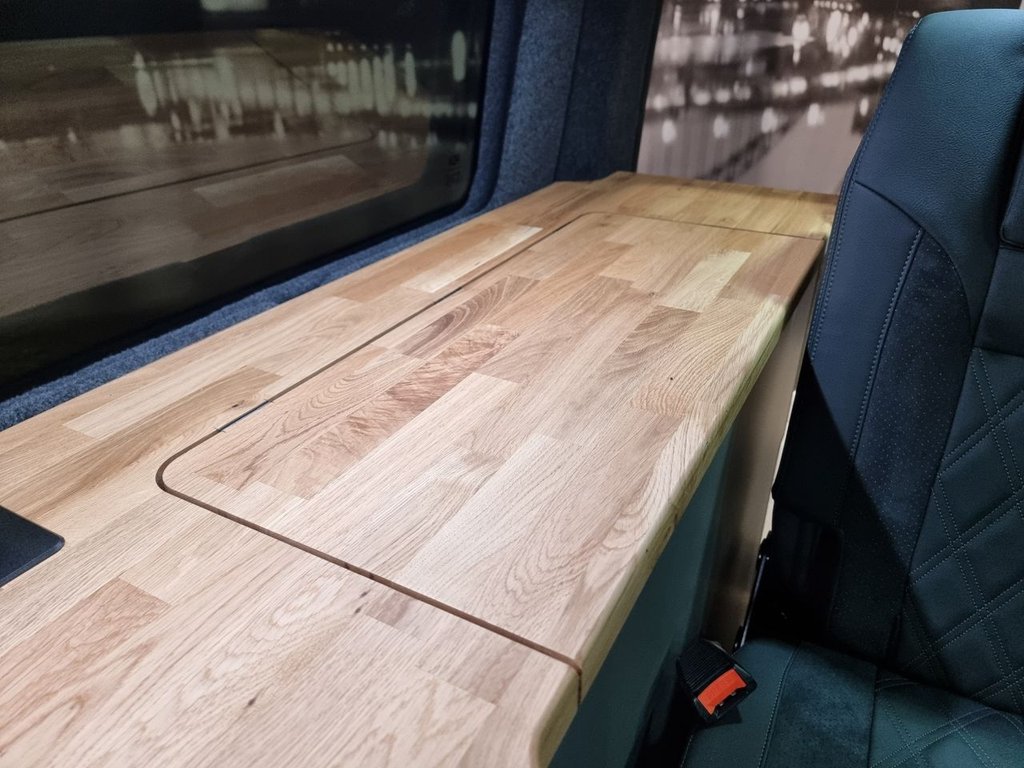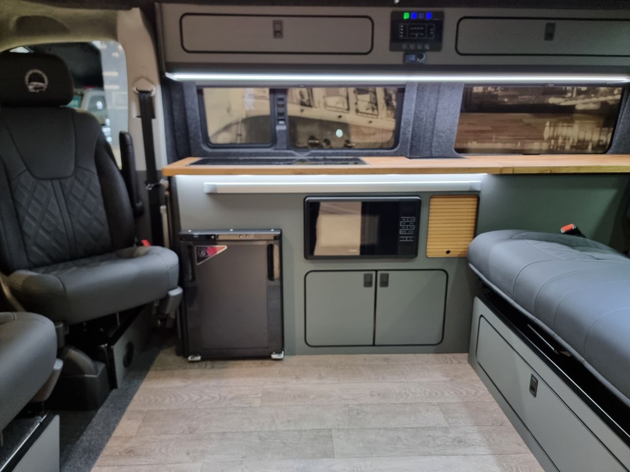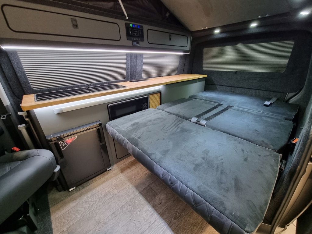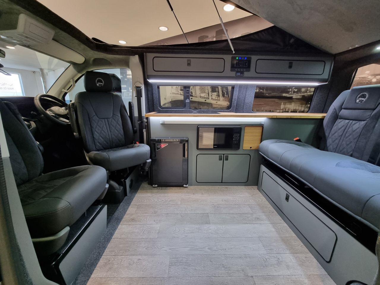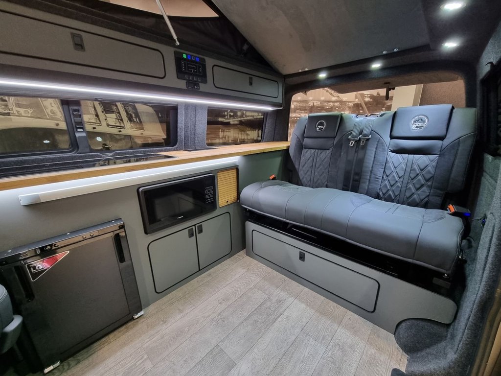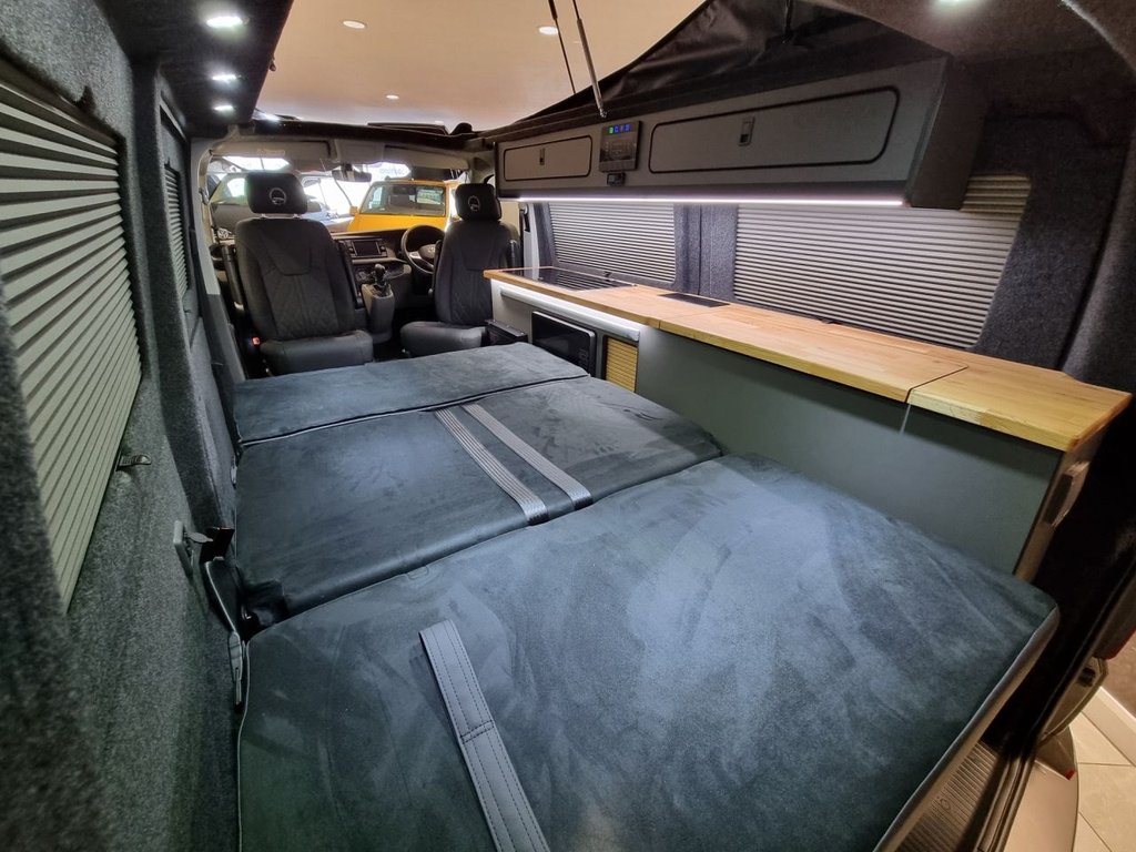 Westdubs poptop roof with scenic canvas Elevating upper bed system Privacy glass all-round Full extended furniture Solid oak worktop with hinged lid for storage Oak tambour doors to match worktop Flush soft close doors with black flush catch's Can double burner and sink unit Fold down tap 50L fridge freezer with LG compressor Dometic camper spec microwave CBE PC180 power management system Sterling split charge system Flush mount soft close sockets - 2 x 240v & 1 x double usb Cool white LED lighting throughout Onboard 130amp leisure battery Onbaord gas locker for 907 gas bottle Under chassis 69L water tank High pressure shower Storage for thetford 335 porta potti within cabinetry Vanshade thermal blinds throughout Planar 2kw diesel heater with 7 day programmable timer M1 tested Fabworx rock n roll bed