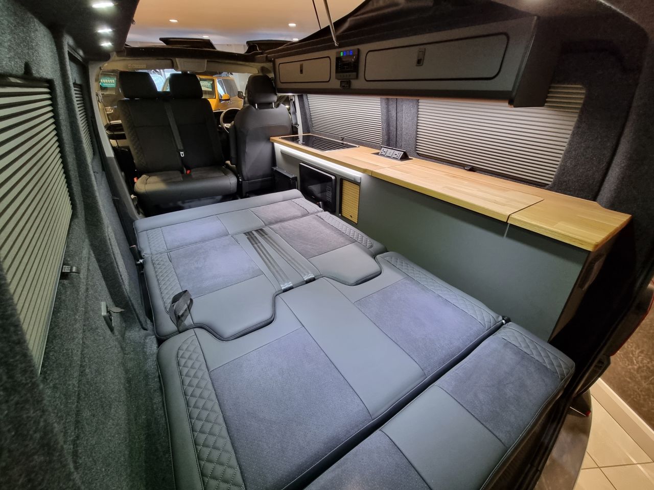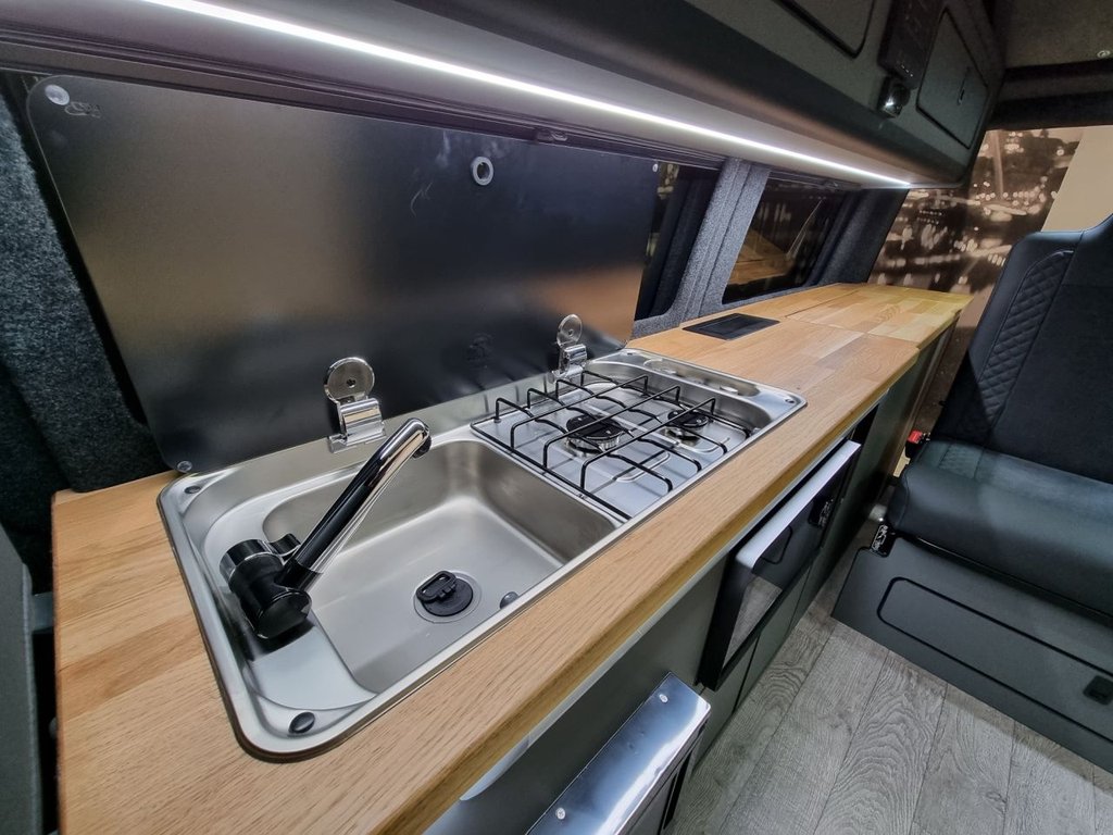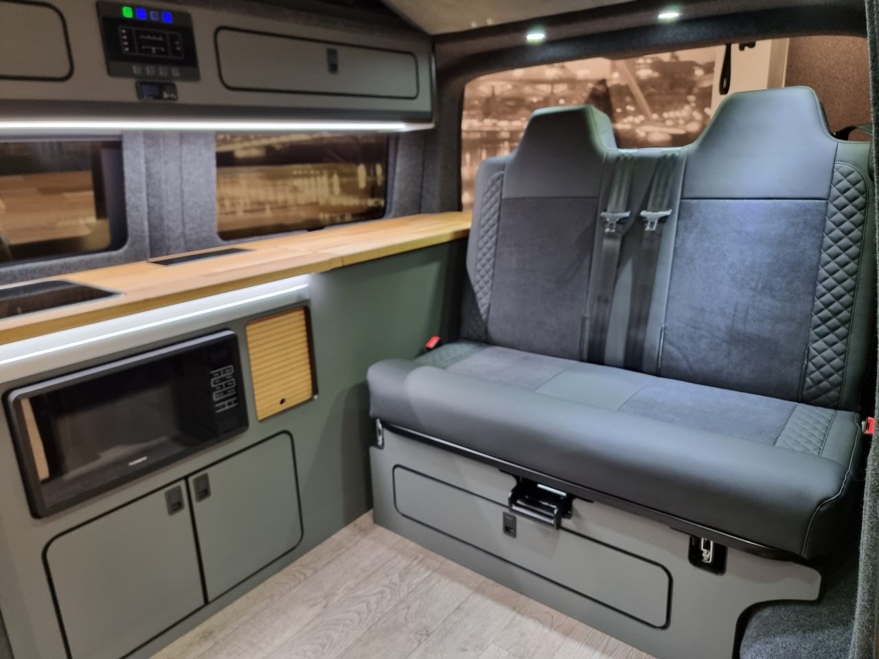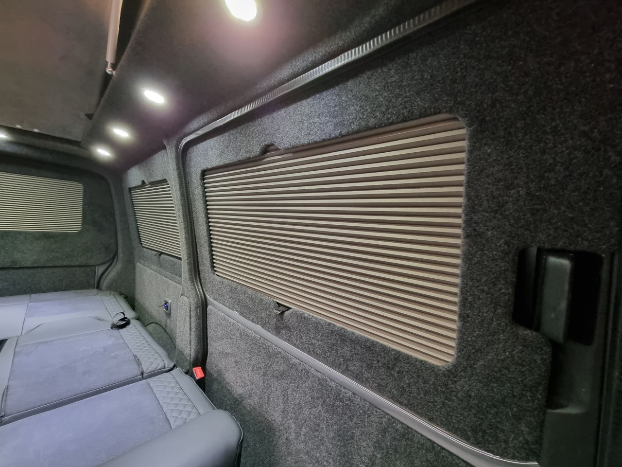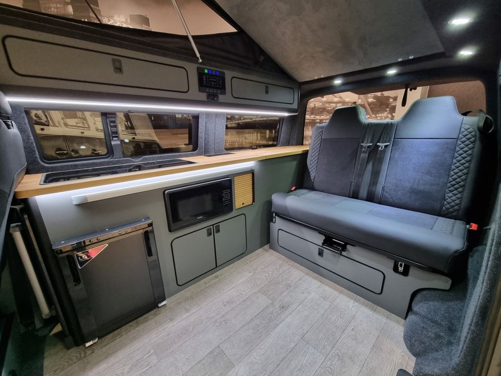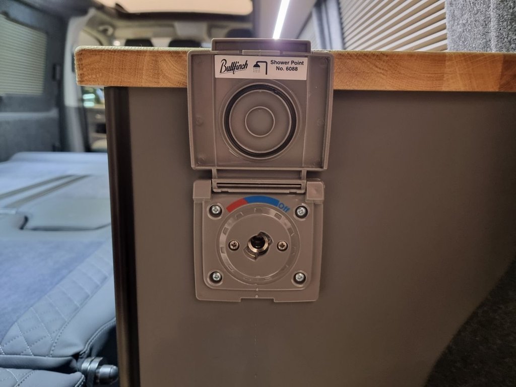 Westdubs poptop roof with scenic canvas Elevating upper bed system Privacy glass all-round Full extended furniture Solid oak worktop with hinged lid for storage Oak tambour doors to match worktop Flush soft close doors with black flush catch's Can double burner and sink unit Fold down tap 50L fridge freezer with LG compressor Dometic camper spec microwave CBE PC180 power management system Sterling split charge system Flush mount soft close sockets - 2 x 240v & 1 x double usb Cool white LED lighting throughout Onboard 130amp leisure battery Onbaord gas locker for 907 gas bottle Under chassis 69L water tank High pressure shower Storage for thetford 335 porta potti within cabinetry Vanshade thermal blinds throughout Planar 2kw diesel heater with 7 day programmable timer M1 tested Fabworx rock n roll bed