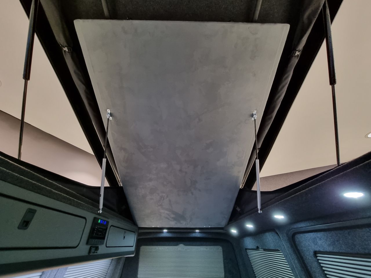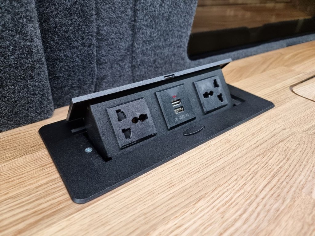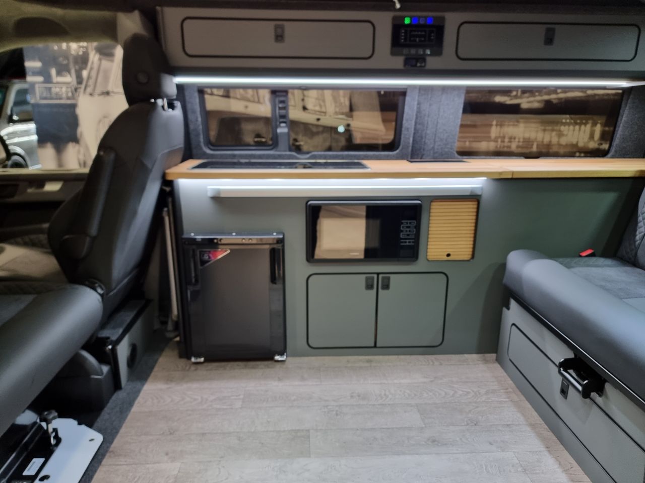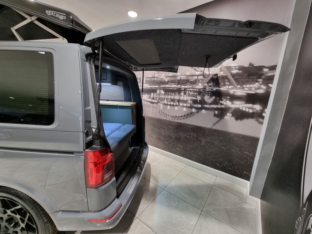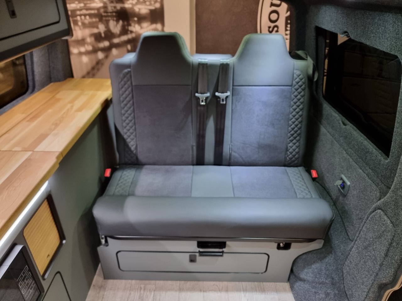 Westdubs poptop roof with scenic canvas Elevating upper bed system Privacy glass all-round Full extended furniture Solid oak worktop with hinged lid for storage Oak tambour doors to match worktop Flush soft close doors with black flush catch's Can double burner and sink unit Fold down tap 50L fridge freezer with LG compressor Dometic camper spec microwave CBE PC180 power management system Sterling split charge system Flush mount soft close sockets - 2 x 240v & 1 x double usb Cool white LED lighting throughout Onboard 130amp leisure battery Onbaord gas locker for 907 gas bottle Under chassis 69L water tank High pressure shower Storage for thetford 335 porta potti within cabinetry Vanshade thermal blinds throughout Planar 2kw diesel heater with 7 day programmable timer M1 tested Fabworx rock n roll bed