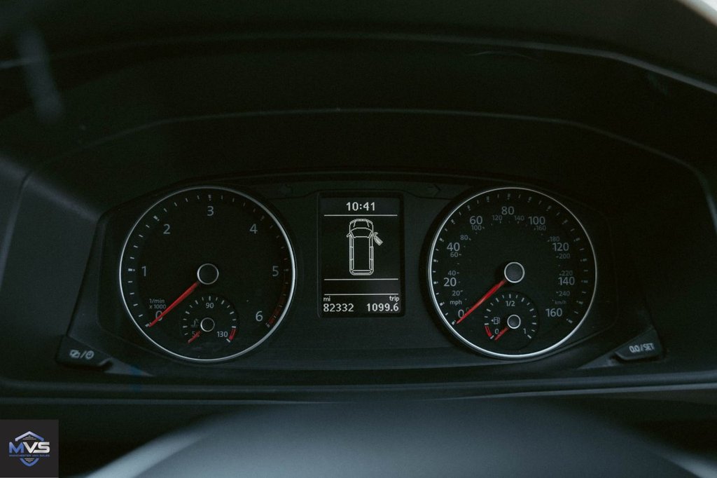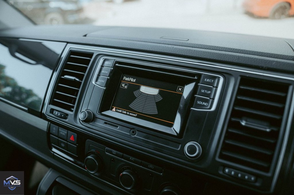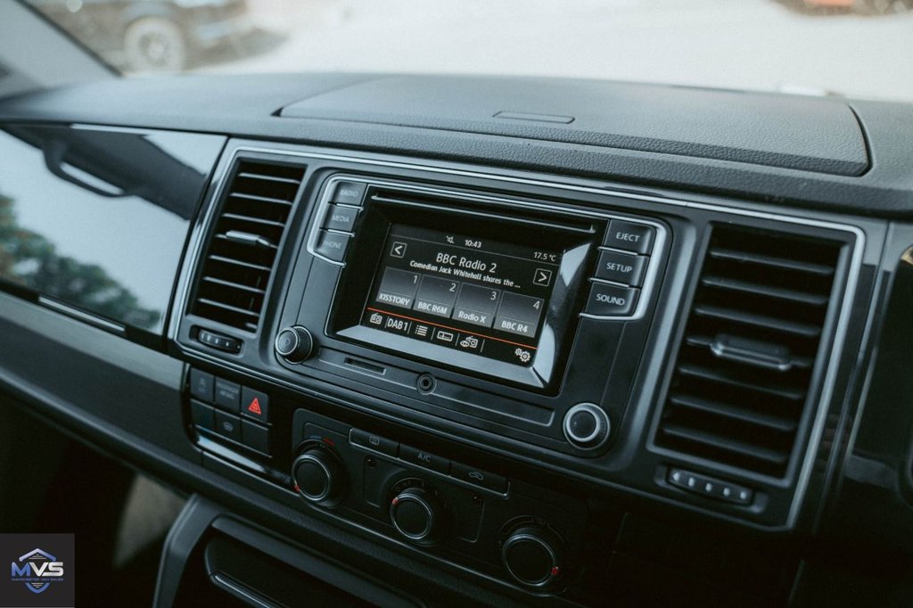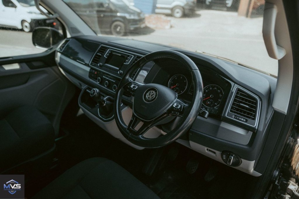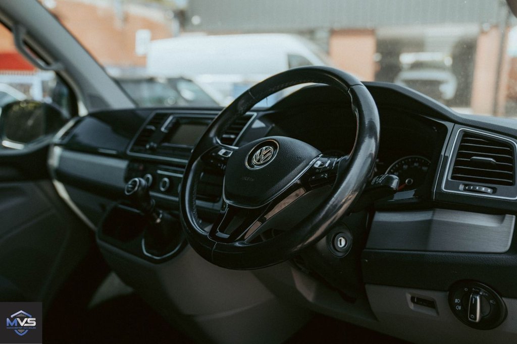 17" Devonport alloy wheels, 2 rear interior lights, switchable by door, 2 storage trays in dashboard, 2 sun visors folding and pivoted, 3 point inertia reel belt on all seats, 3 seater rear bench, 4 speakers, ABS with electronic brake distribution, Additional 12v accessory socket, Automatic headlights, Body coloured bumpers, Body coloured door handles, Body coloured door mirrors, Cab comfort pack - Transporter Kombi, Cab interior light, Chrome plated strip on air intake charge air cooler, Collision prevention assist, DAB radio/CD player, Diesel particulate filter, Digital clock, Drinks holder, Driver alert with Multi-function display plus, Drivers airbag, Drivers seat adjustable for reach and rake, Dust/pollen filter, EDL, Electric front windows, ESP, Front and rear towing rings, Front fog lights with cornering function, Front passenger airbag deactivation, Headlight range control, Heat reflective glass, Heated front windscreen, Height adjustable head restraints, Height adjustable seatbelts for outer cab seats, Height and rake adjustable steering column, Interior (cab only) and tow away protection, Interior entry steps, Internal central locking control, Locking glovebox, Locking wheel bolts, Multifunction leather steering wheel, gearknob and gaiter, No windows in rear side panels, Open storage compartment in dash panel including mobile phone holder, Parking brake - hill hold control, Passenger seat with reach and rake adjustment, Remote central/dead locking + 2 keys, Rev counter, SD card slot, Seatbelt warning indicator, Service indicator, Storage compartments in doors, Storage net on lower dash passenger side, Thatcham category 1 alarm, Traction control, Trip computer, Tyre pressure monitor