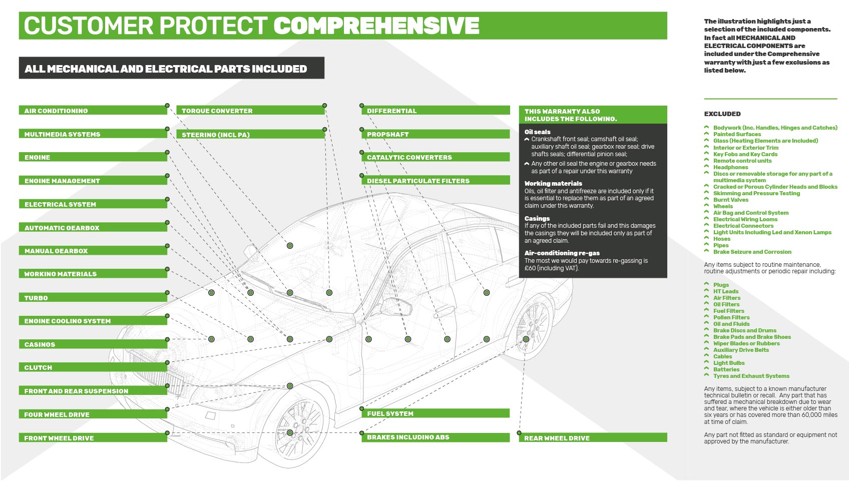 The Comprehensive Warranty covers against the inconvenience, stress and cost when any Mechanical or Eletrical part within your vehicle breaks down. Therefore, minimising the strain on your wallet.